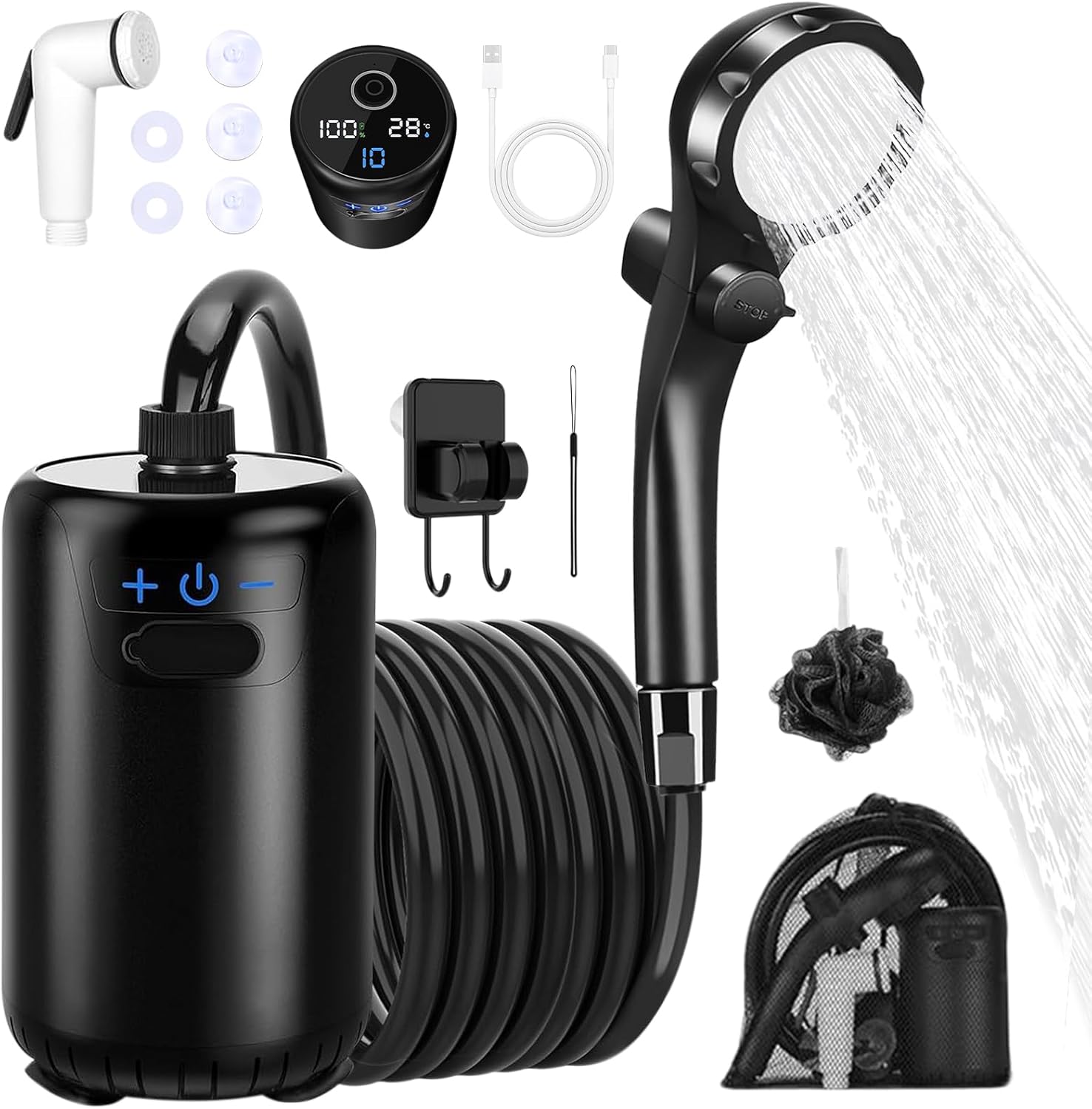 Worth buying if you want a rechargeable, IPX7 portable shower pump setup with an LED readout and a suction/filtered bucket intake—especially for camping and travel where you don’t have mains water pressure.
