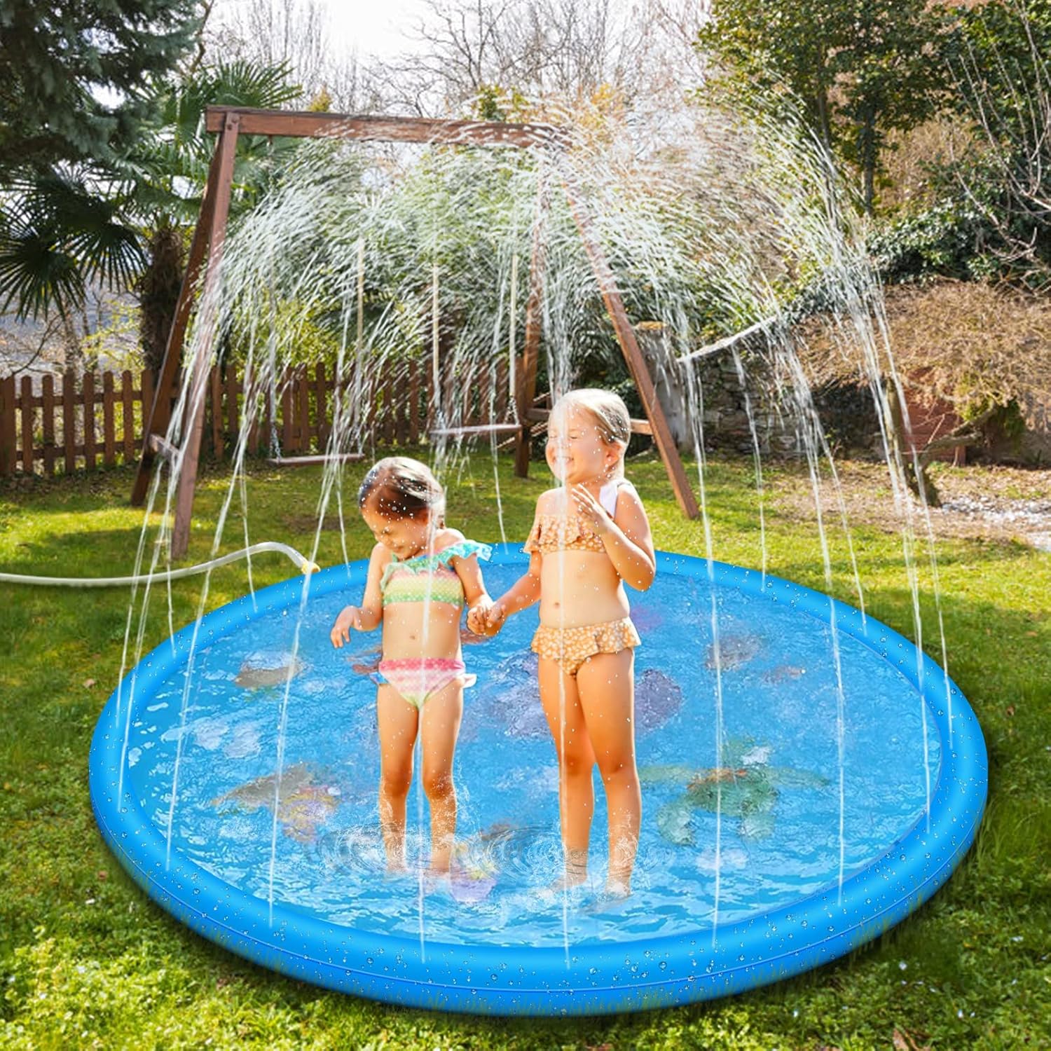 This is a 170 cm / 68" splash pad. The listing frames it for use in outdoor spaces like a swimming pool area or the garden, whether that’s a calm afternoon or a little party with friends.