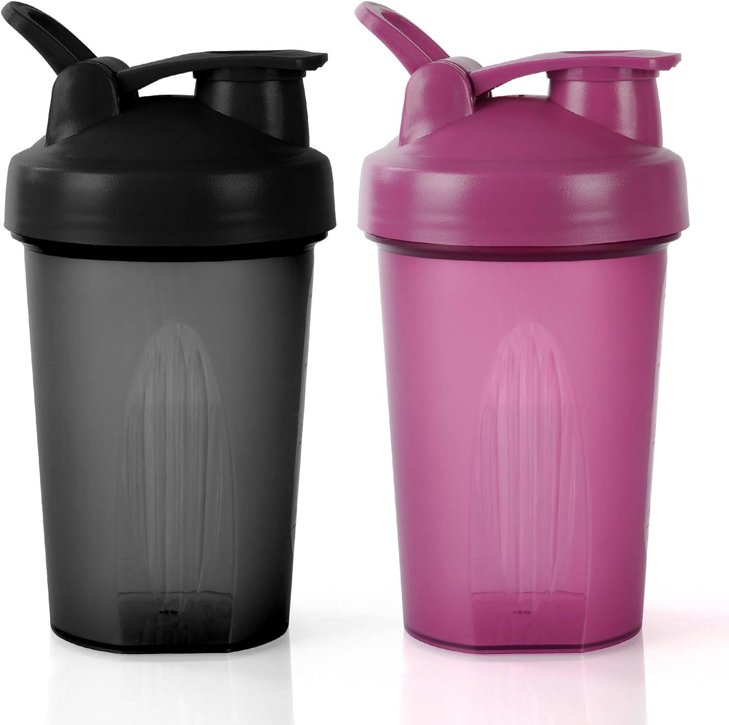 AOGOE Protein Shaker Bottle with Stainless Steel Mixing Ball (400ml, 2 pack) – leak proof flip lid, BPA free – Black + Purple
