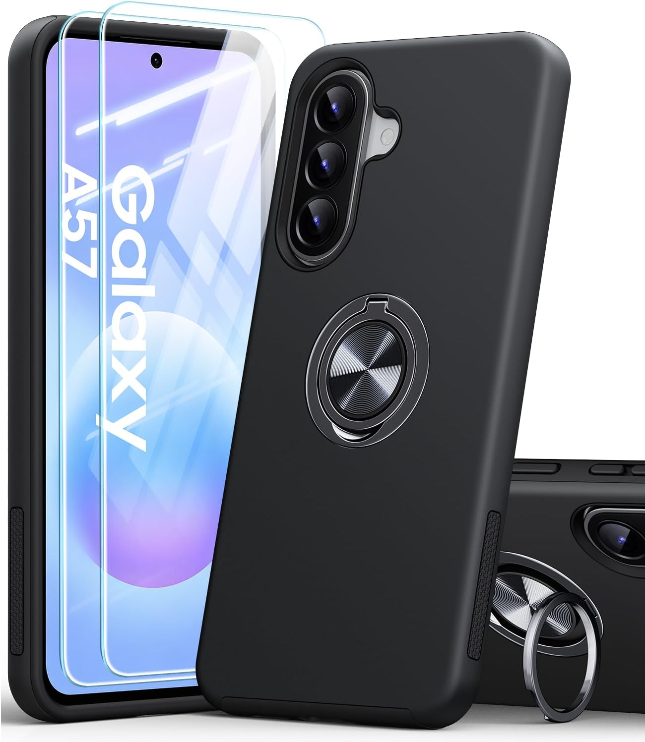 AOUIA case for Samsung Galaxy A57 5G with 2-pack screen protector, 360° rotating ring kickstand – Black