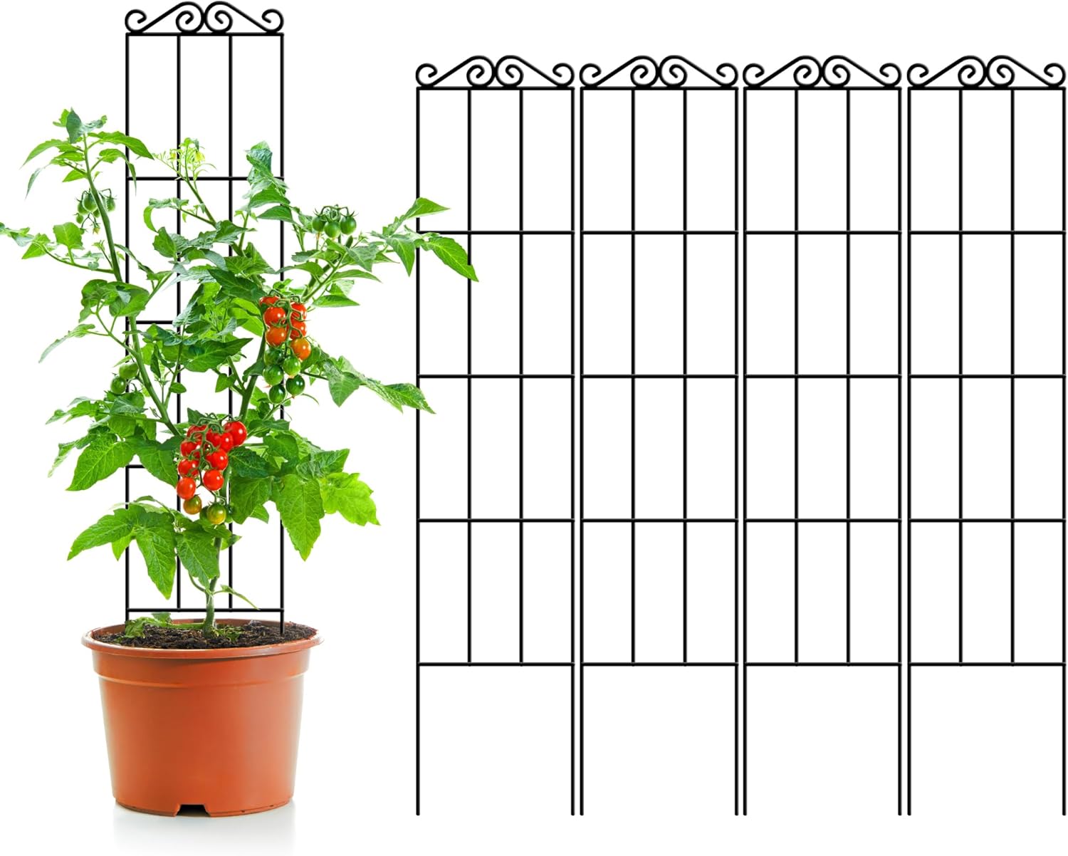 This is a pack of four metal plant trellis panels from ARIFARO, each sized at 58 inches high by 12 inches wide. The idea is simple: place the trellis next to a pot (or several pots), let the climbers grab hold as they grow, and use the vertical space you already have.