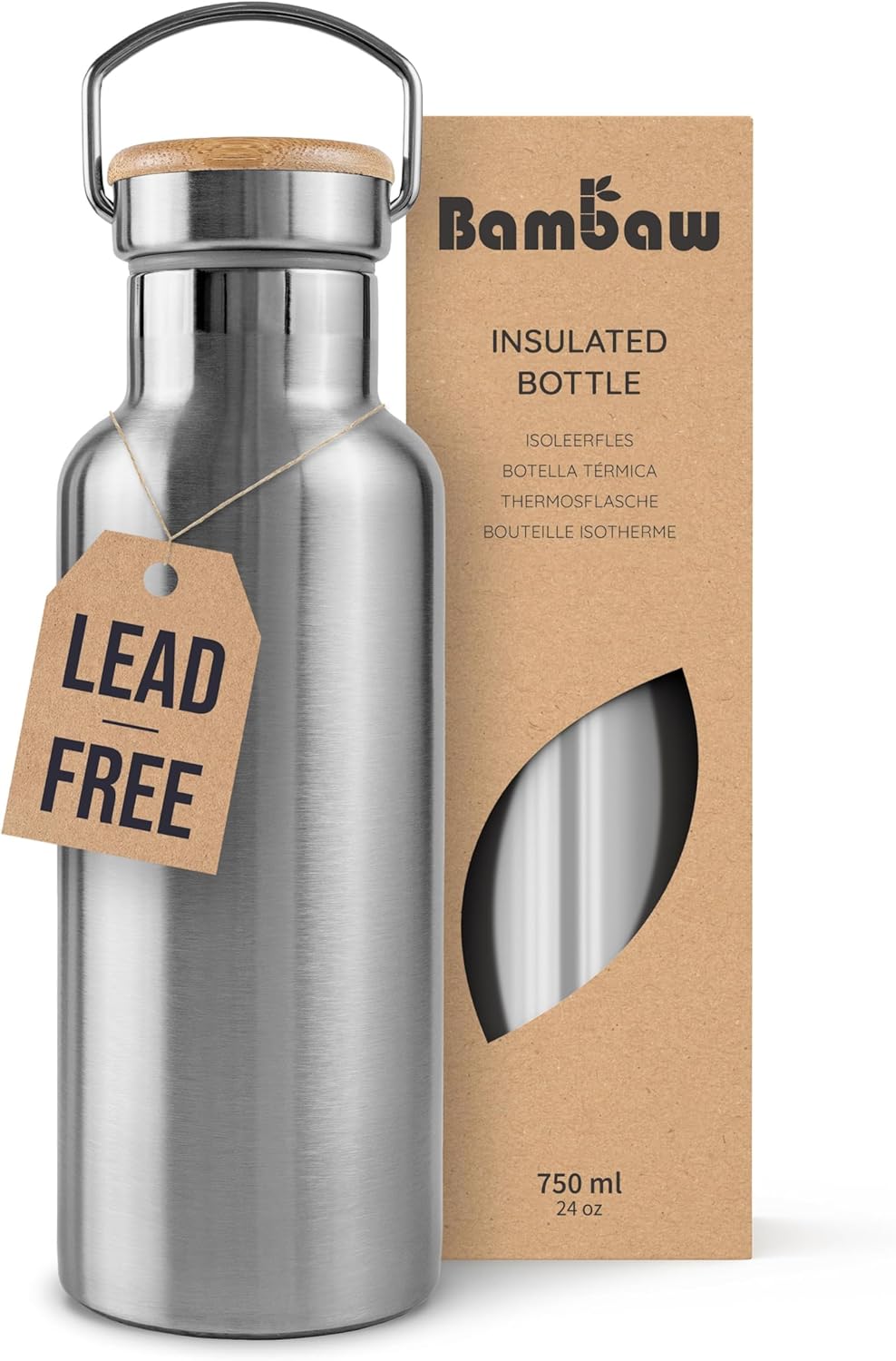 Bambaw insulated stainless steel water bottle 750ml (natural steel) for hot & cold drinks