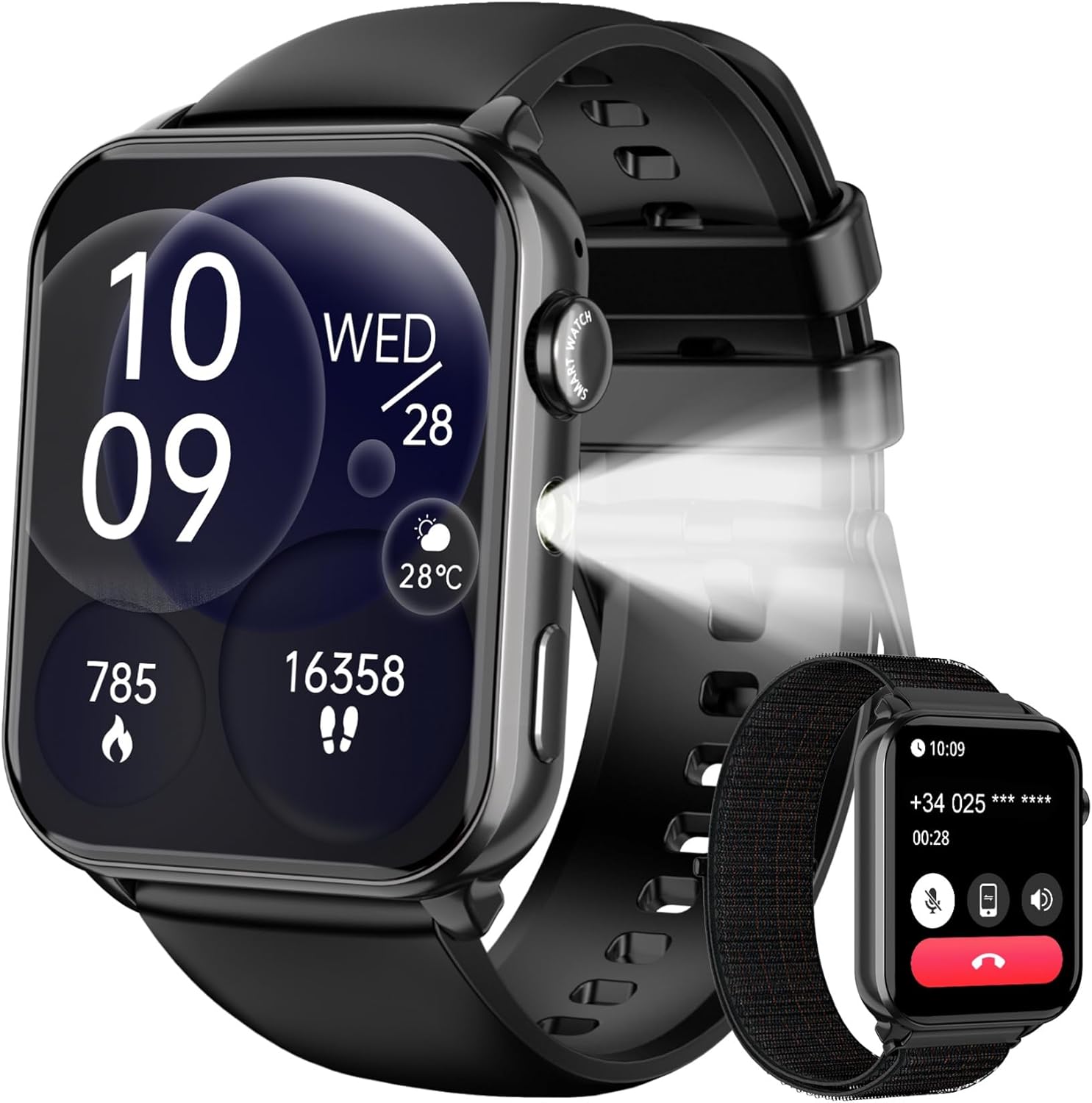 Worth considering if you want a mid-range style smartwatch approach—1.91" HD touchscreen, heart rate and sleep monitoring, Bluetooth notifications, and call functions—plus the extra practicality of an LED flashlight and 2 straps.