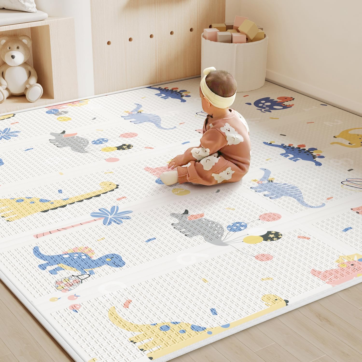 The 120x120x1CM size is the most obvious fit for floor play areas that aren’t huge. It suits a typical corner of a living room, a nursery play zone, or a setup alongside a baby play gym. For a concrete example: you can lay it down for tummy time on the dinosaur side, then flip to the islands/track side later when your toddler’s playing becomes more “route and ramp” than “explore and crawl.”