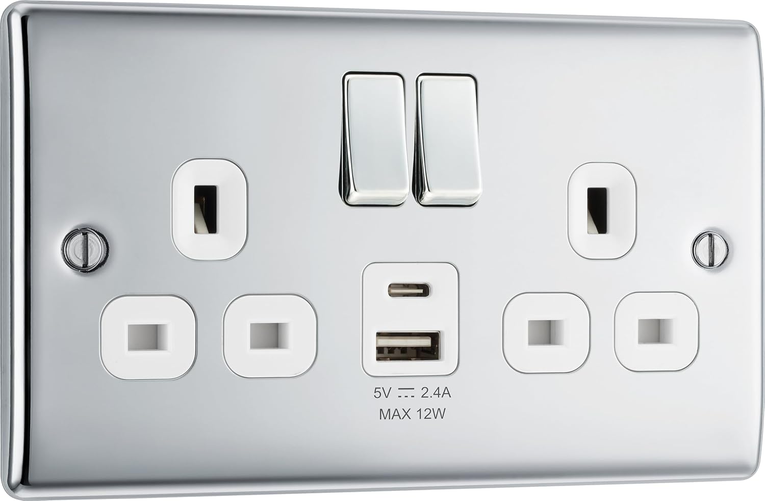 BG Electrical 12W Nexus metal double switched wall socket with Type A & C USB (13A) – polished chrome NPC22UAC12W