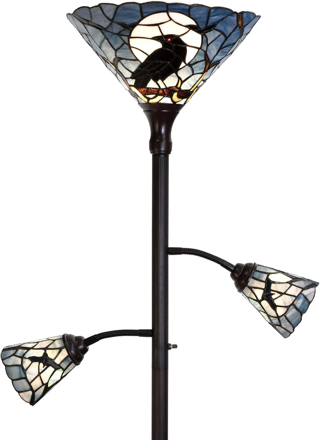Bieye L50957 Tiffany-style stained glass 3-light torchiere floor lamp with adjustable reading lights (Dark Blue, Crow)