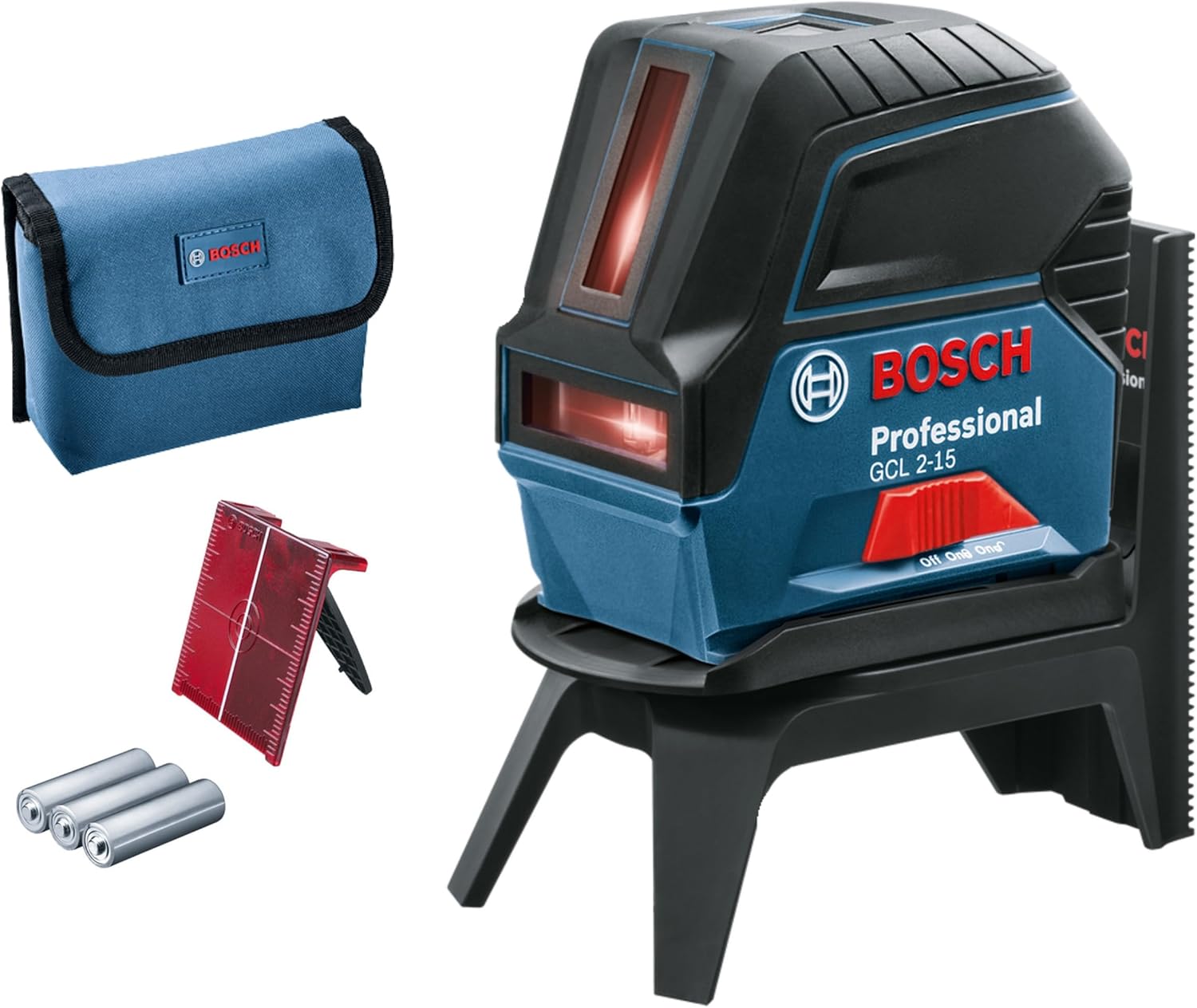 You get the GCL 2-15, the RM 1 rotating mount, 3 x AA batteries, the laser target plate, a protective bag, and an L-BOXX inlay.
