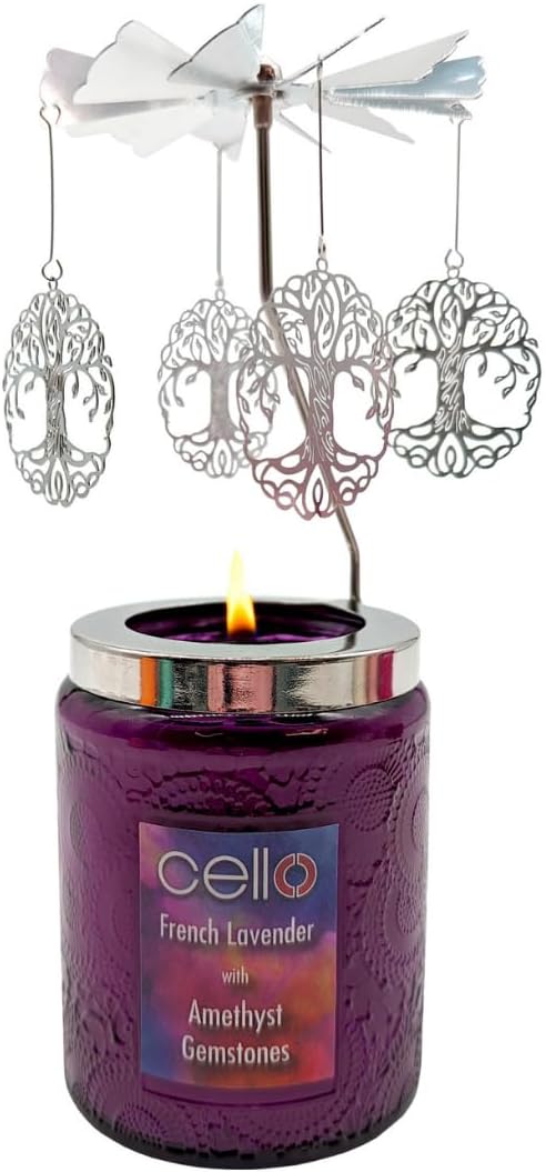 This Cello amethyst-scented candle is built around a specific idea: you burn a fragrance candle now, and you still end up with something collectible or decorative afterwards. The set includes a small candle and a spinning candle carousel/holder, with 3 amethyst gemstones meant to be left in the holder once the candle’s finished.