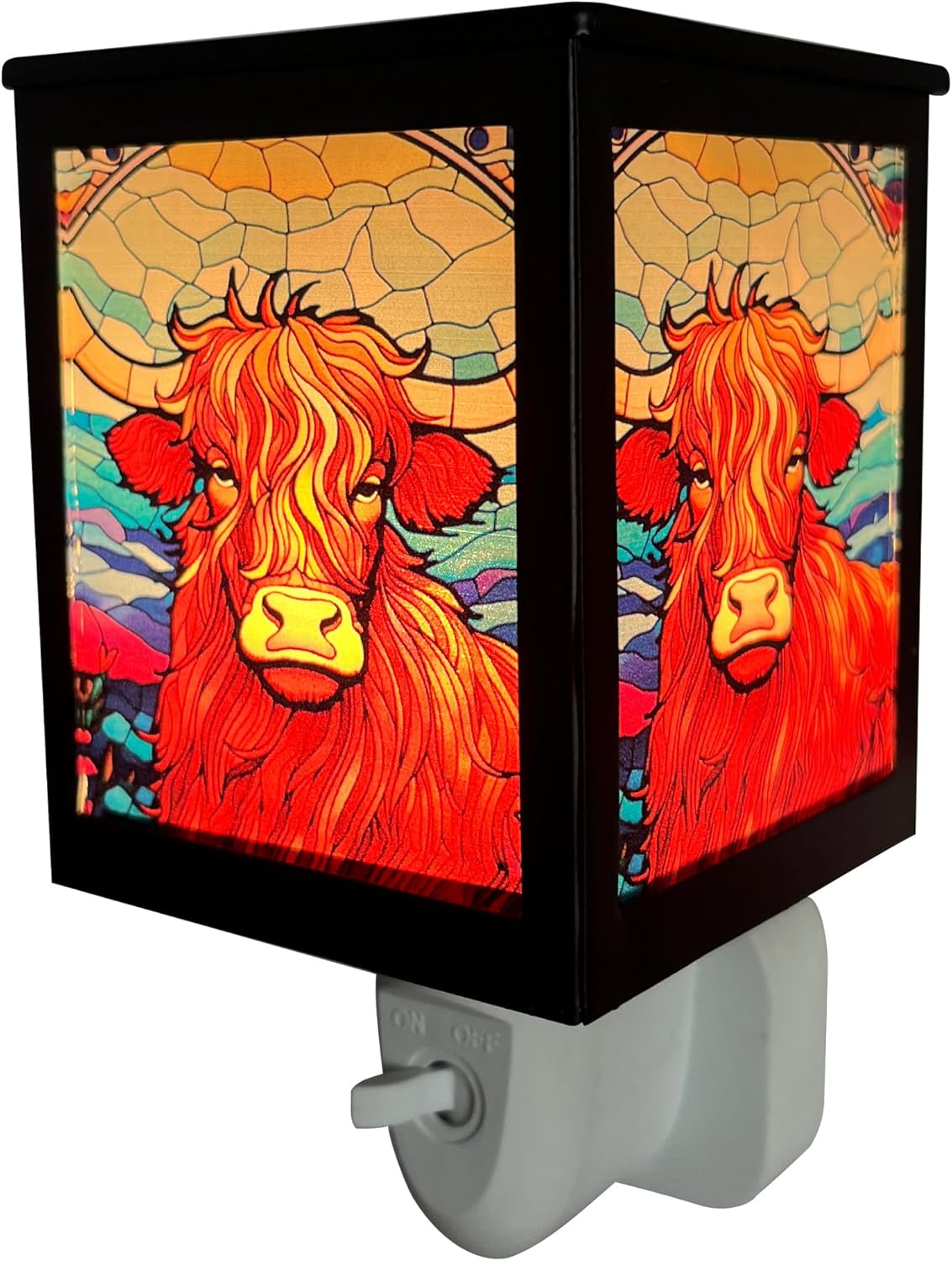 - Highland cow stained-glass-style glow for an ambient décor effect