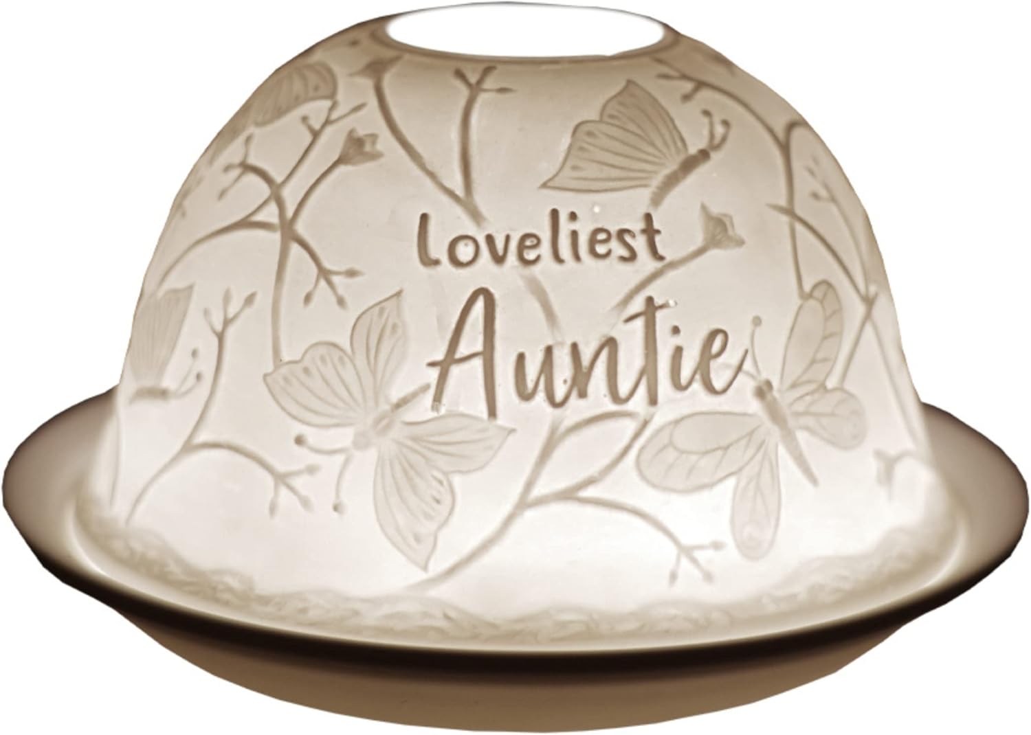 What you’ll likely like: - A decorative porcelain dome that aims to look good even before lighting - A themed “Loveliest Auntie” message with butterfly imagery that lights up - The lithophane-style projection concept gives it more personality than a basic tealight holder - Works with tealights or battery-operated LED lights (helpful for different preferences)
