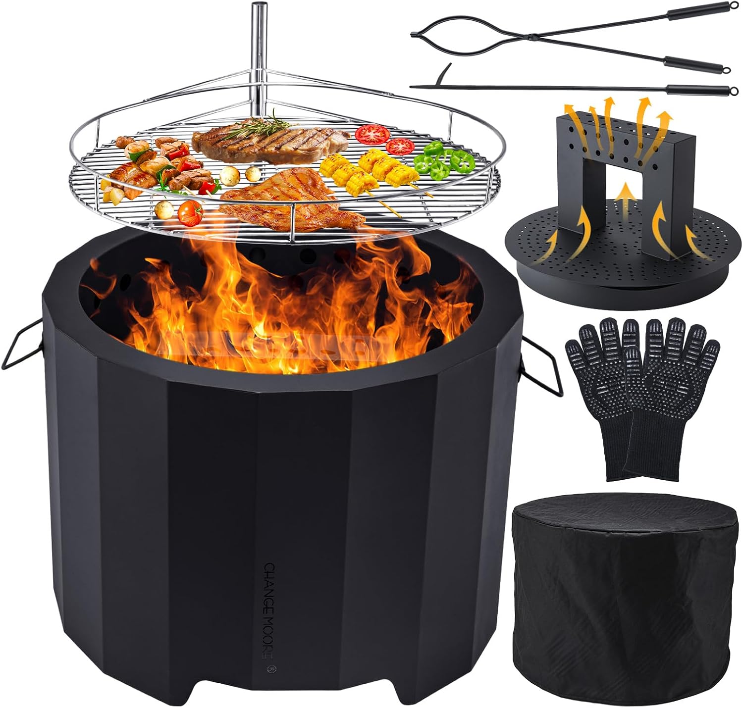This CHANGE MOORE CHANGEMOORE Smokeless Fire Pit makes sense if you want a wood burning fire pit stove that’s designed around better airflow and a triple burn approach, plus easier ash management via a removable ash collector. The included scald-proof gloves, dust cover, and cooking-capable stainless steel grill make it feel more “ready to use” than stripped-back alternatives.