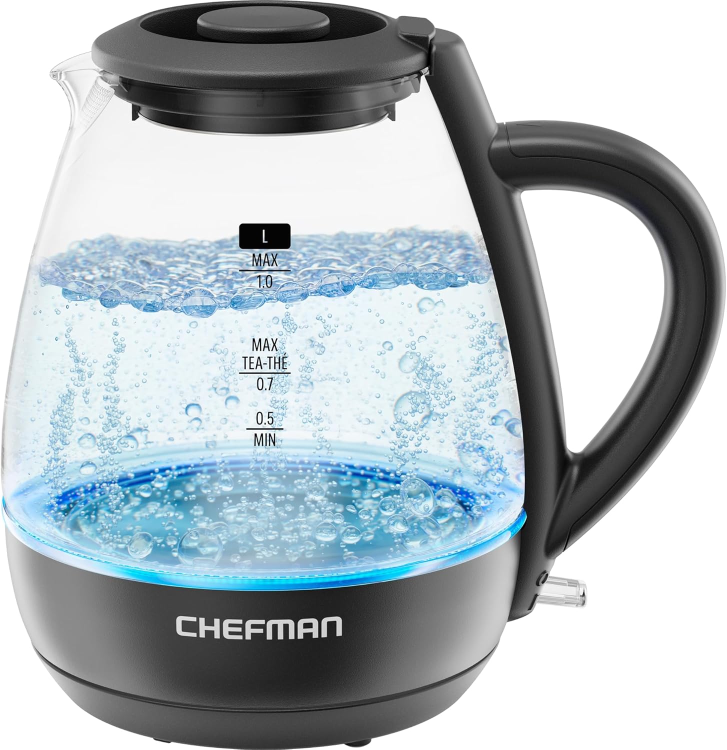 The Chefman 1L electric tea kettle heats water quickly for everyday hot drinks, combining a compact 1 litre capacity with useful safety features and cordless serving. It suits small kitchens, offices or student rooms where fast boiling and easy cleaning matter.