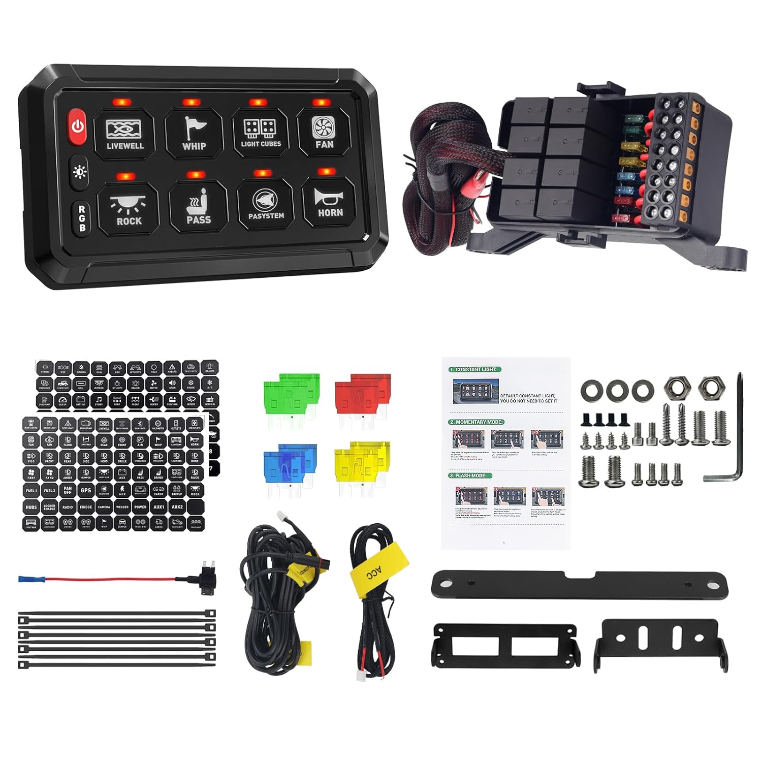 It’s a solid pick if you want an all-in-one switch panel approach—8 switches, RGB backlighting with adjustable brightness/effects, and a relay box/fuse setup included in the pack. For many installers, that’s the difference between a tidy build and a messy one.
