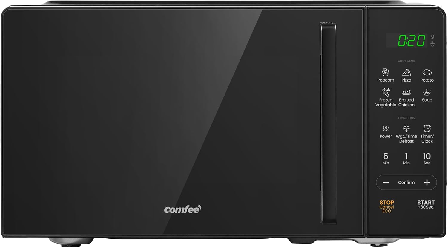 The COMFEE' CMO-EM202NF is a compact 20L countertop microwave that balances everyday convenience with thoughtful features. With 700W power and inverter technology, it suits simple reheating, defrosting and quick meals in small kitchens or student flats. The larger viewing window helps you check progress without interrupting a cycle, and the black finish keeps the unit discreet on a crowded worktop.
