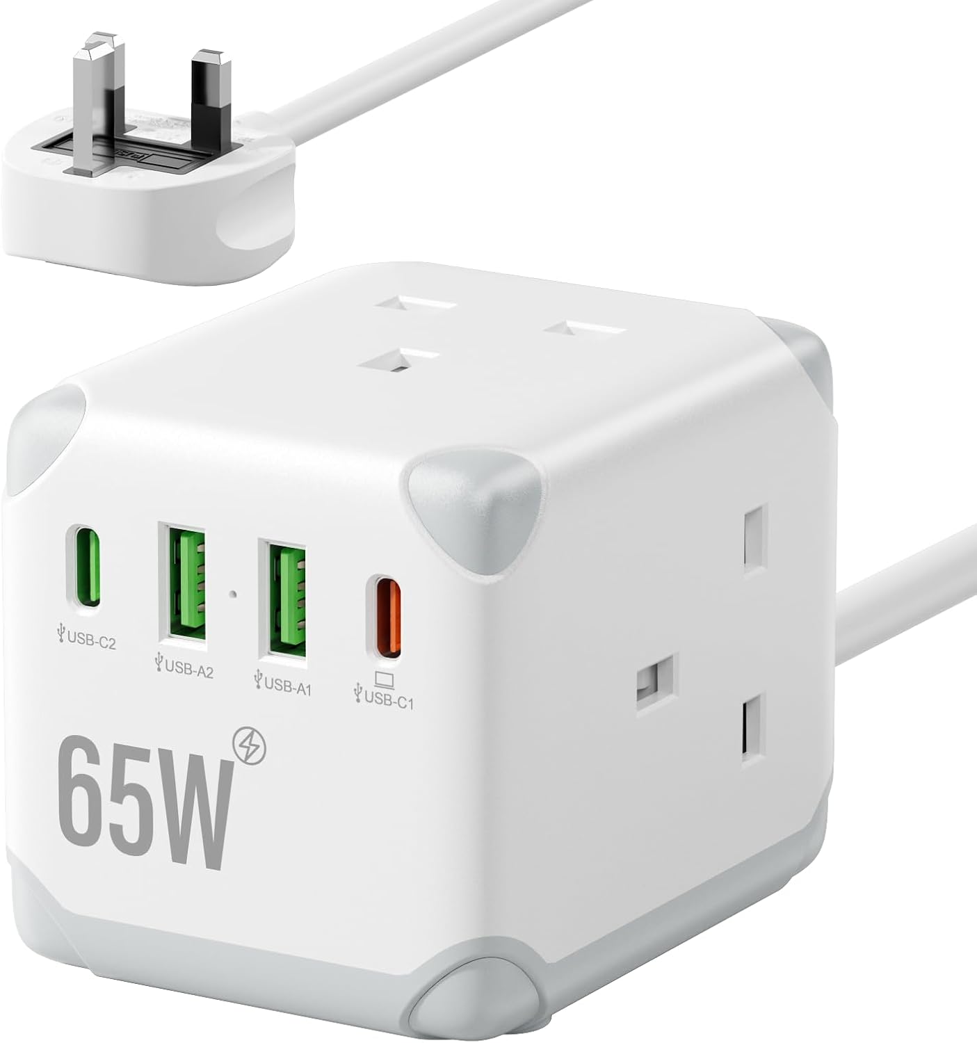 This cube extension lead provides a compact, all‑in‑one charging solution for a busy home office or living space. It combines three UK sockets with two USB‑A ports and two USB‑C ports, designed to power laptops, tablets, phones and smart devices from a single convenient hub. The PD65W USB‑C port handles high‑power devices efficiently when used alone, while the remaining ports share power to keep multiple gadgets charged without compromising performance. Its space saving cube form keeps desks tidy and makes it easy to place the unit exactly where you need it, especially in compact workstations.