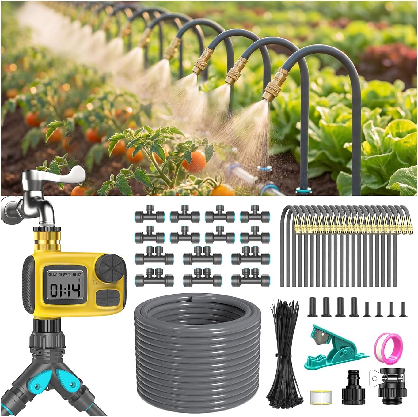 - Format: Hose timer + main tubing + 20 adjustable 360° nozzles + spray stake hub