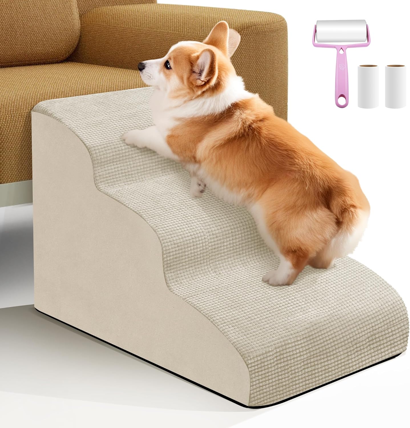 This three-step pet ramp helps small dogs and cats climb onto sofas and beds with less strain, combining a lightweight foam core and a removable washable cover for easy maintenance. It suits pets that need gentler access to elevated furniture and reduces joint pressure during climbs according to the manufacturer.