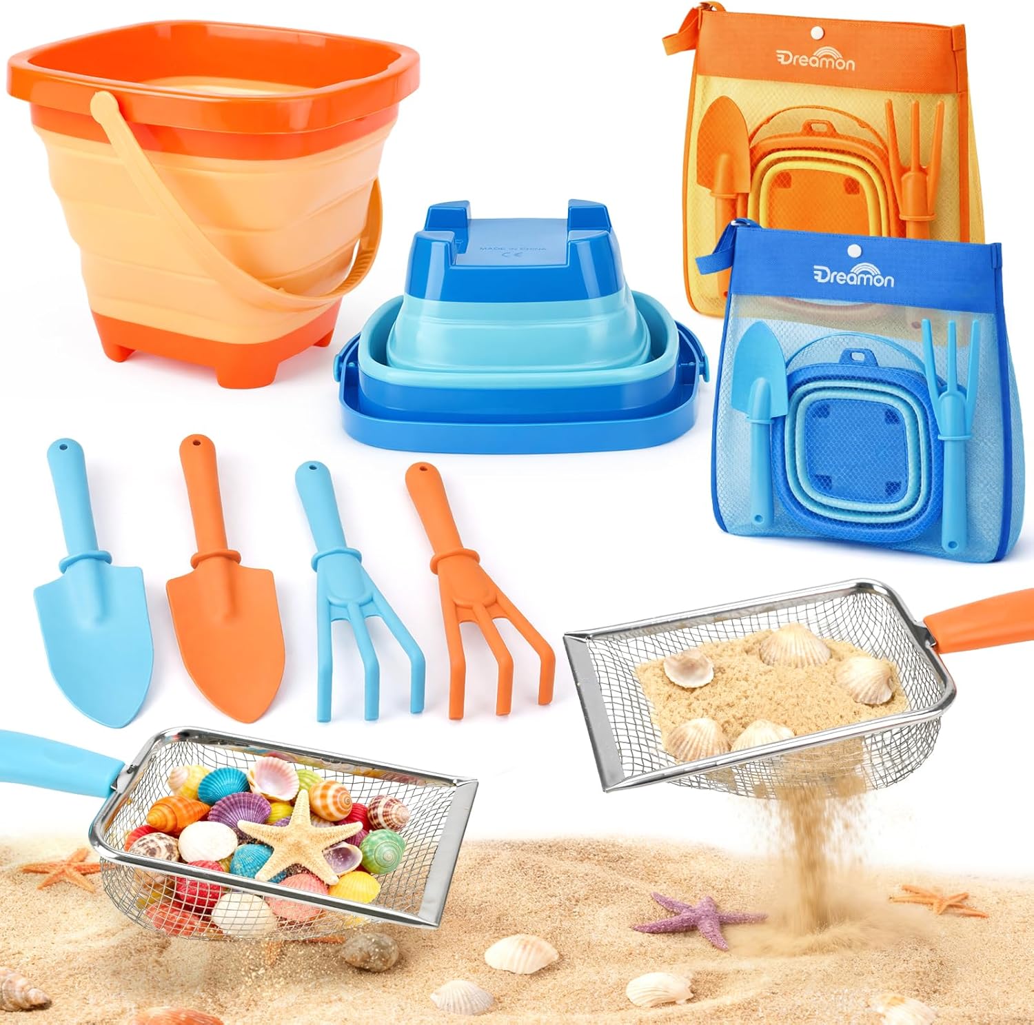 Dreamon Beach Sand Toys 2-Set: collapsible buckets, sifters, shovel & rake with seashell bag (kids 3–5)