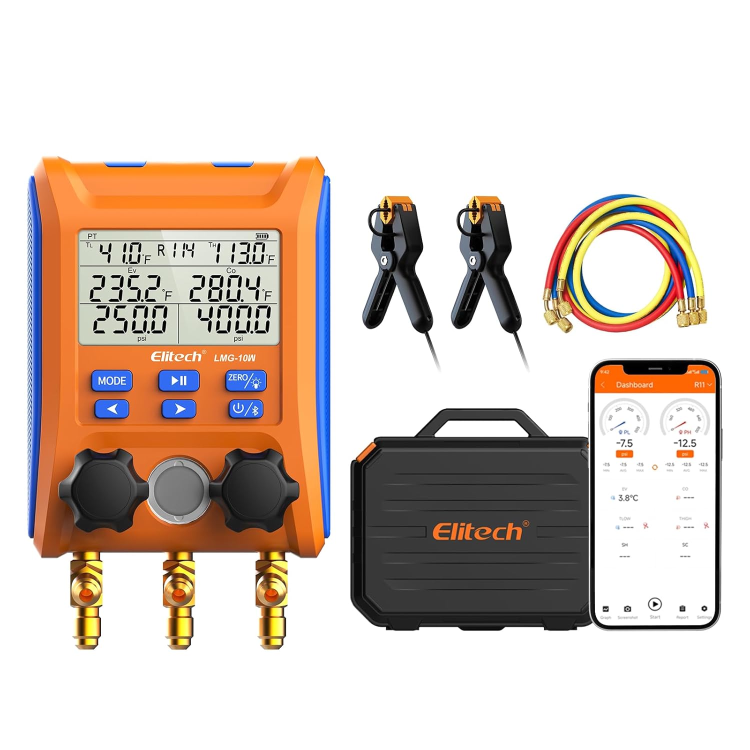 - Name: Elitech Digital Manifold Gauge Set 2-Way Valve Wireless HVAC Gauge with APP Monitoring and Temperature Clamps Hose for Refrigeration A/C Heat Pump (LMG-10W)