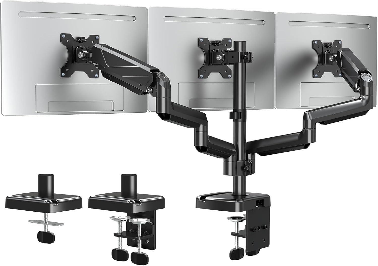 Worth considering if: - you want a triple-screen desk mount for monitors in the 13–27 inch range - your screens use VESA 75x75 or 100x100 - you prefer a gas-powered mount with a lot of positioning freedom (rotation, tilt, and swivel) - you need a choice of C-clamp vs grommet mounting depending on desk thickness and available holes