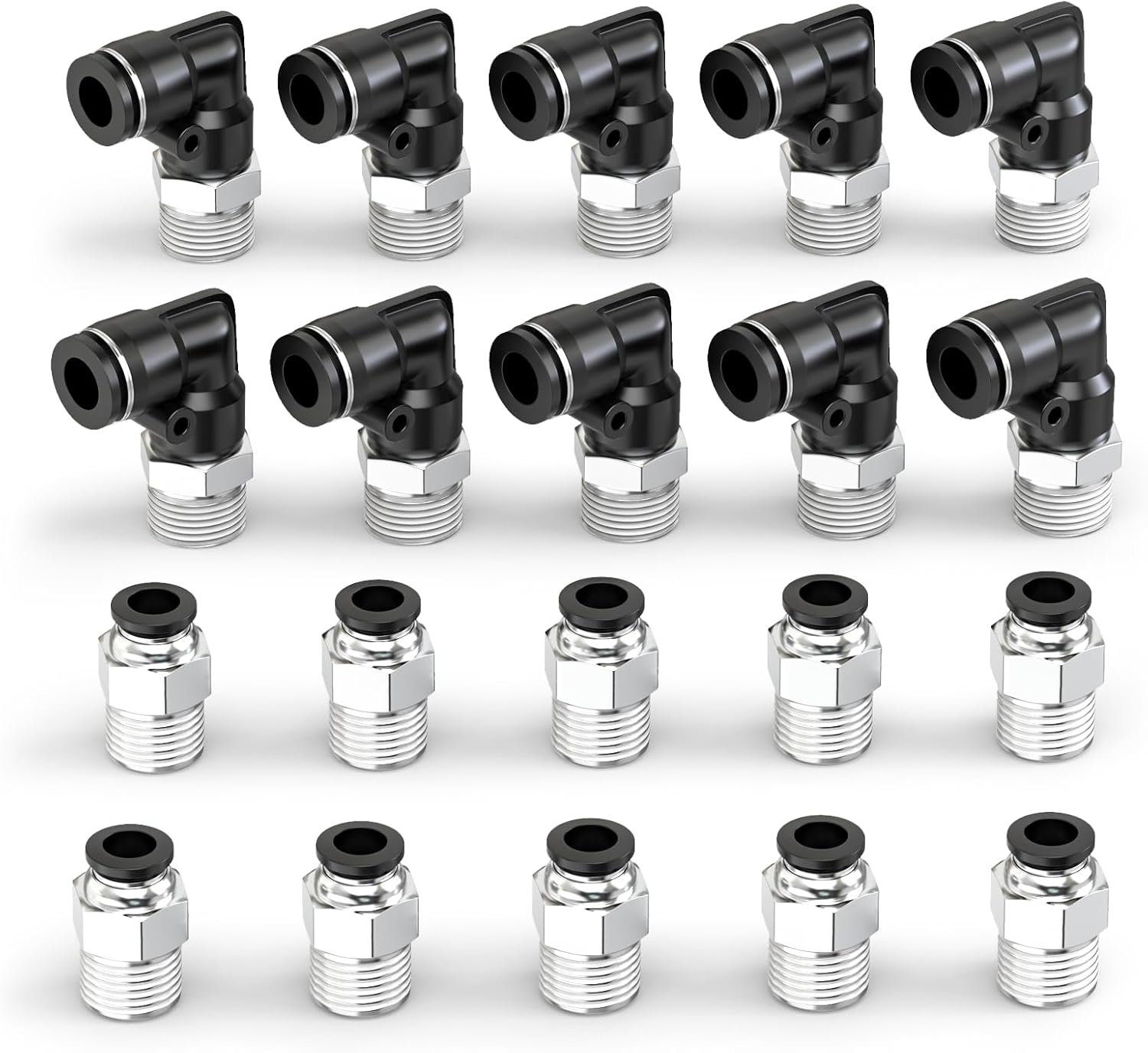 This product is described as a 10-piece set including black elbow and straight push-in connect fittings. The most practical approach is to plan your routing first—then use straight connectors for the linear runs and elbow fittings where you need a change of direction.