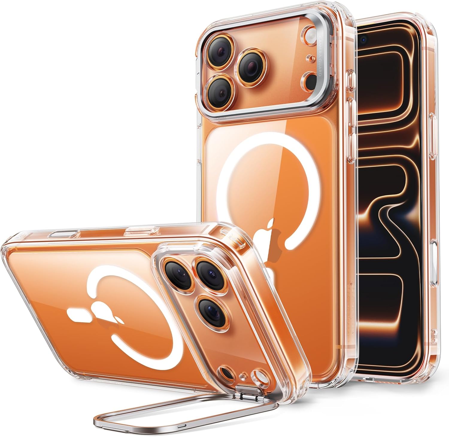 This clear protective case from ESR for the iPhone 17 Pro Max combines magnetic MagSafe compatibility with a built-in adjustable stand and reinforced protection, making it useful for hands-free viewing, quick wireless charging and reliable device handling. It supports precise camera control through tactile inputs, and its transparent back keeps the phone’s finish visible while resisting scratches.