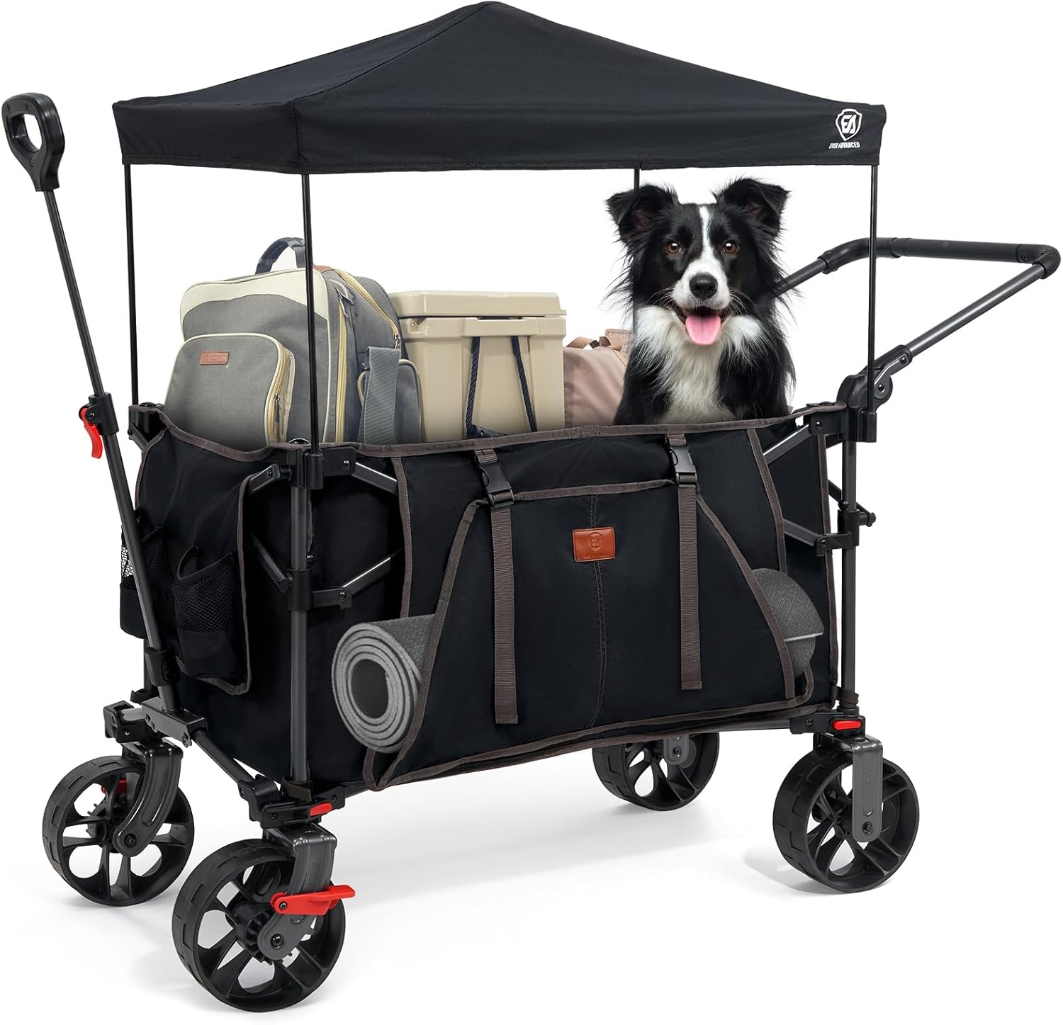 - Pros: high capacity (225L) and deep cargo area, adjustable handles for different heights, all-terrain wheels with brakes, quick release for storage, reflective strips for night use, easy setup and fold, includes side pockets and cup holders.
