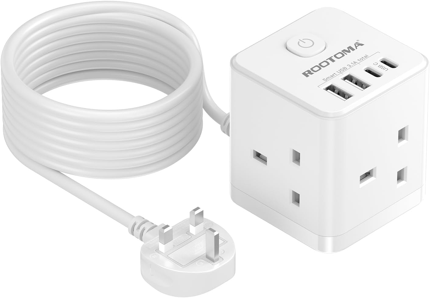 This 5m extension lead with USB slots is built for one common problem: when your wall socket is full, but you still need to power normal appliances and charge devices at the same time. The “cube” design idea is also a practical one—more compact and easier to live with on a desk, in a dorm, or in a living room where space is tight.