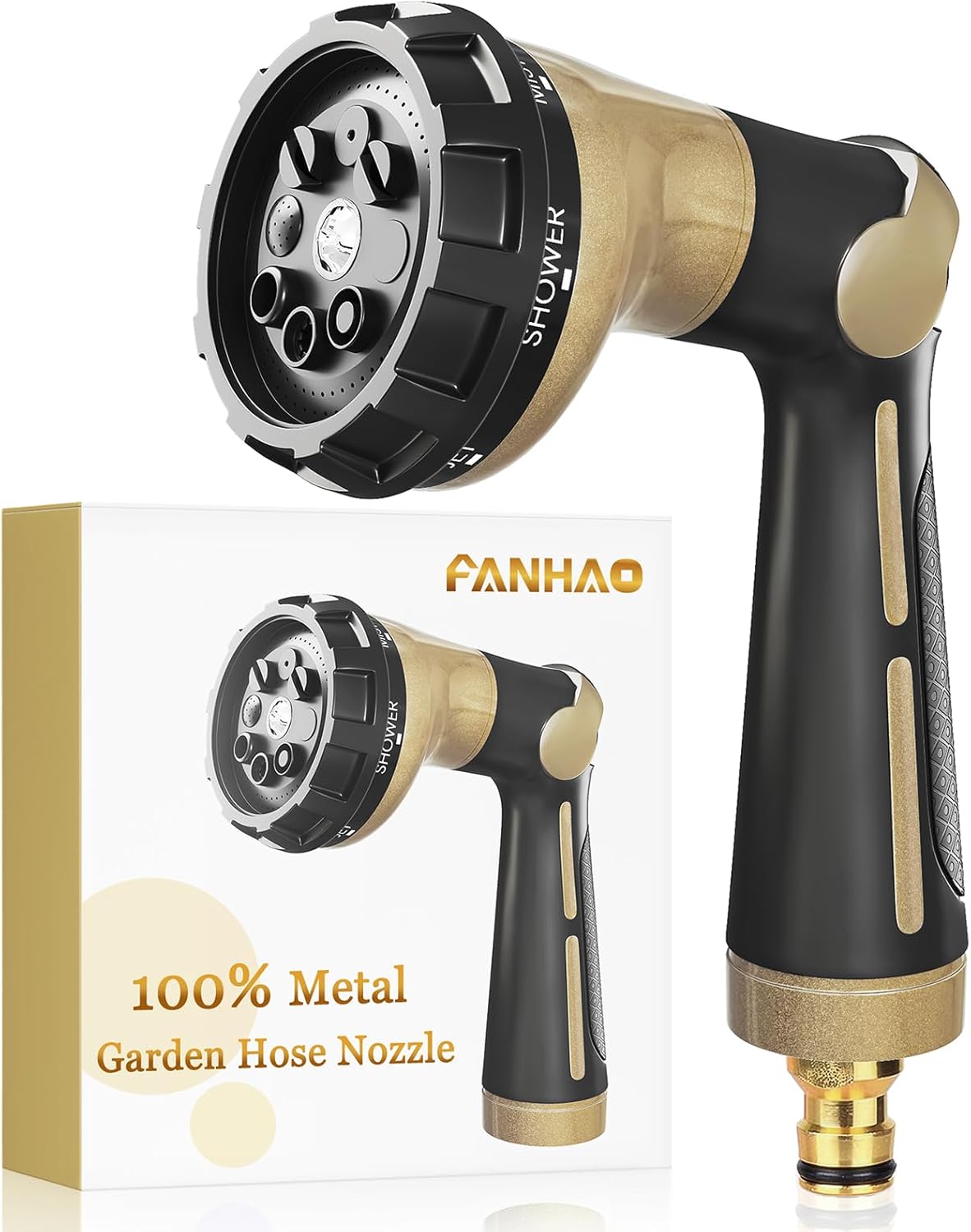 - FANHAO 3/4" metal garden hose spray gun with adjustable patterns and full brass nozzle