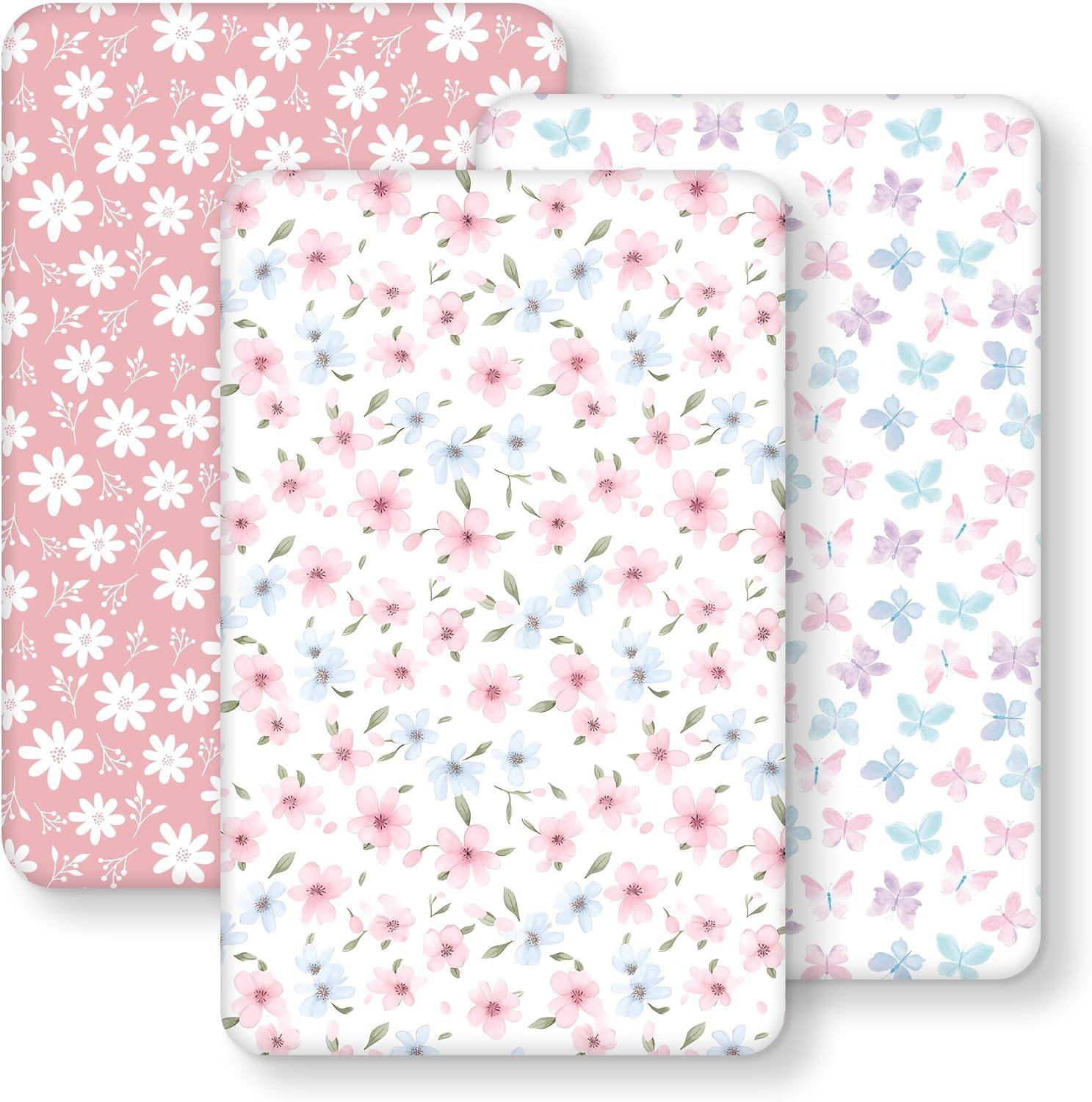 Made from premium microfiber, the sheets are described as soft and skin-friendly, suitable for delicate and sensitive skin. The three-pack brings variety to the nursery with a pink butterfly and flower print that adds a subtle decorative touch while remaining practical. The fabric is breathable enough for everyday use and designed to reduce irritation.