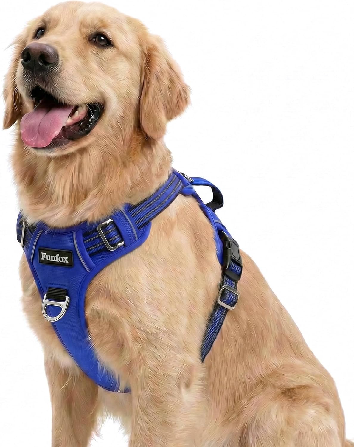 This Funfox no-pull dog harness is a chest-style vest with an adjustable, two-clip layout. The idea is pretty straightforward: if your dog tends to pull, you get a control point at the front (chest ring) and an alternative at the back clip for steadier, calmer walks.