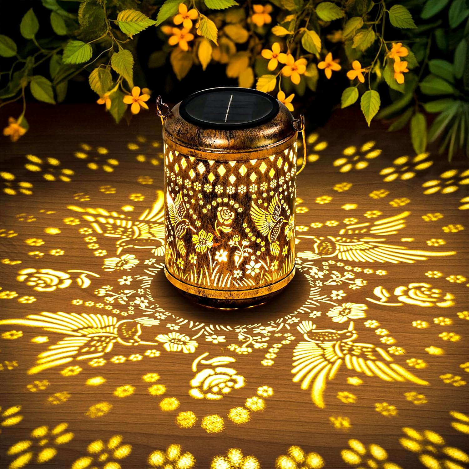 The standout feature is the intricate hummingbird cut-out design. Instead of a flat glow, the lantern projects decorative light patterns that can look surprisingly effective on walls, fences, or sheltered porch areas. Imagine hanging one near an outdoor seating spot: as it gets dark, the bird silhouette and its patterning give the area a calmer, more decorative feel than a plain solar stake.