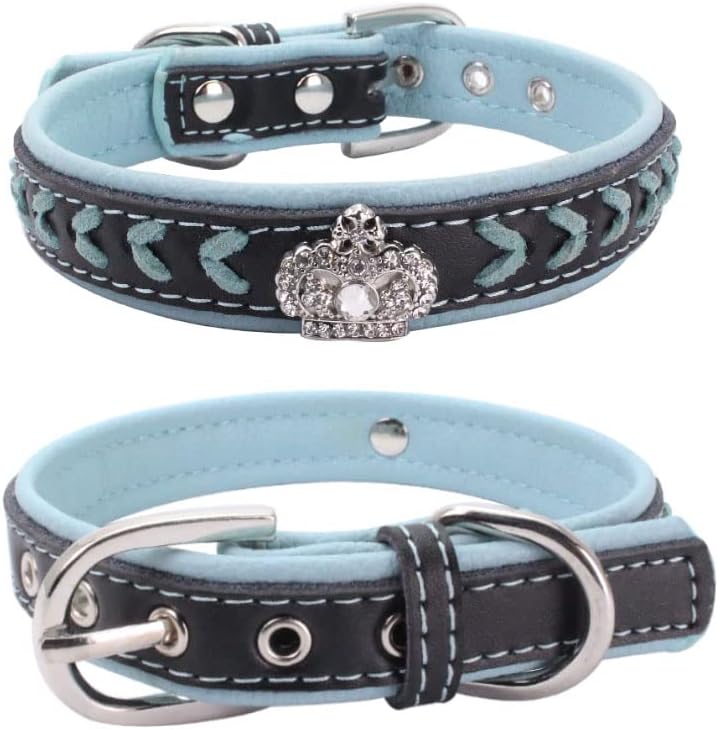 haoyueer Braided Soft Padded Genuine Leather Dog Collar with Rhinestone Crown (Size L, Blue)
