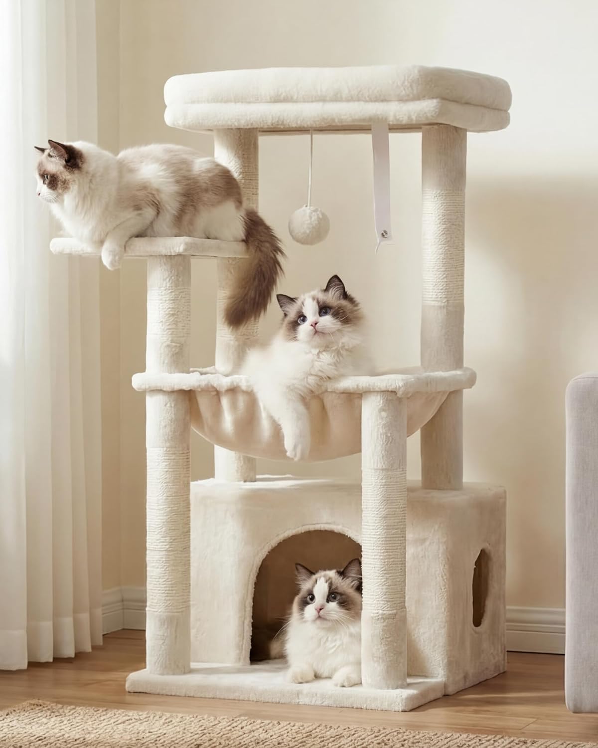 A lot of cat furniture looks good in a room but doesn’t always feel right for the cat. This one’s pitch is clearly comfort-first where it counts: there’s a large resting platform with a soft, fluffy layer, plus an extra-large soft basket made from soft fabric. There’s also a hidden cave bed, and a dangling ball that adds a bit of movement for play sessions.