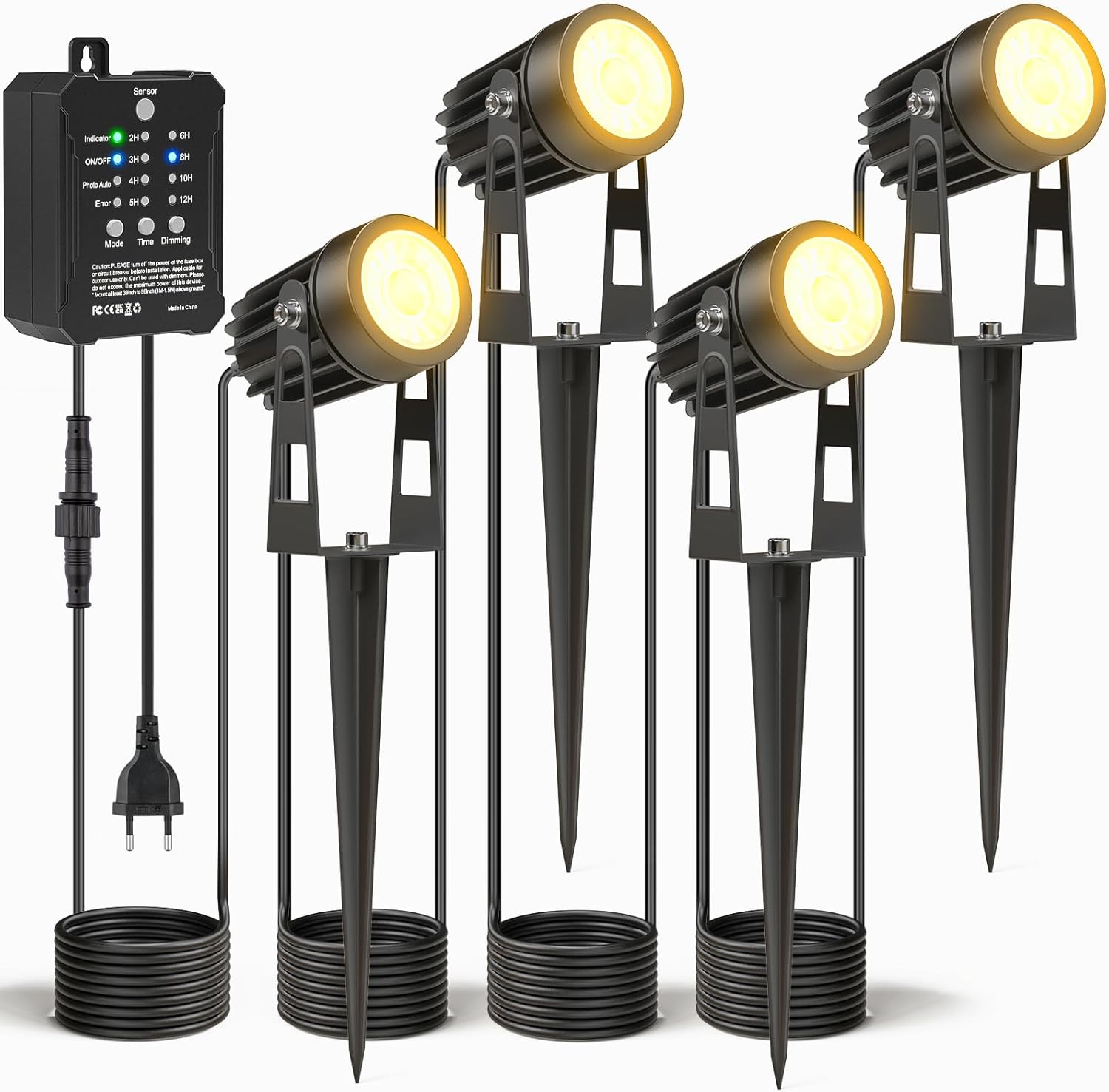 If you want low-fuss garden lighting without relying entirely on batteries or fiddly individual timers, the HIBOITEC mains powered dimmable garden lights kit is designed as a “ready to install” set. It comes as a complete package for outdoor use: four LED garden spotlights plus the landscape cable and a low-voltage transformer. The idea is straightforward—plug in the mains side, then use the transformer’s controls to manage when the lights switch on.