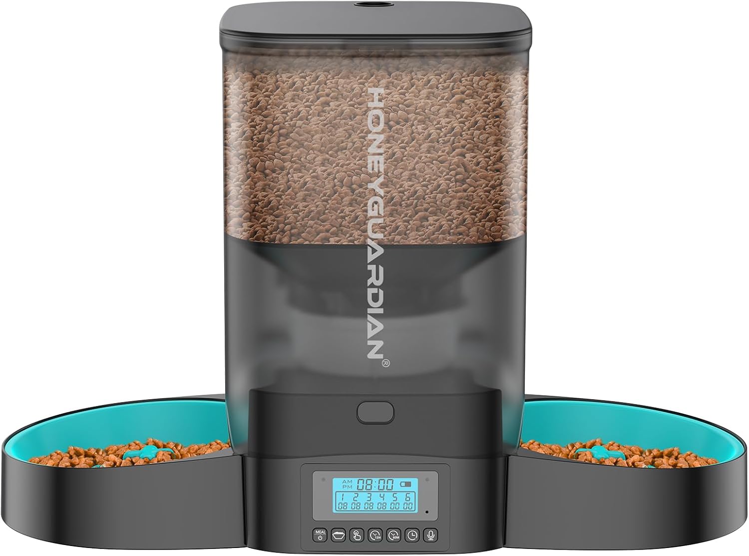 HoneyGuaridan Automatic Cat Feeder for 2 Cats (Dual Bowls) with Slow Feeder Bowls and Fresh-Lock Sealing
