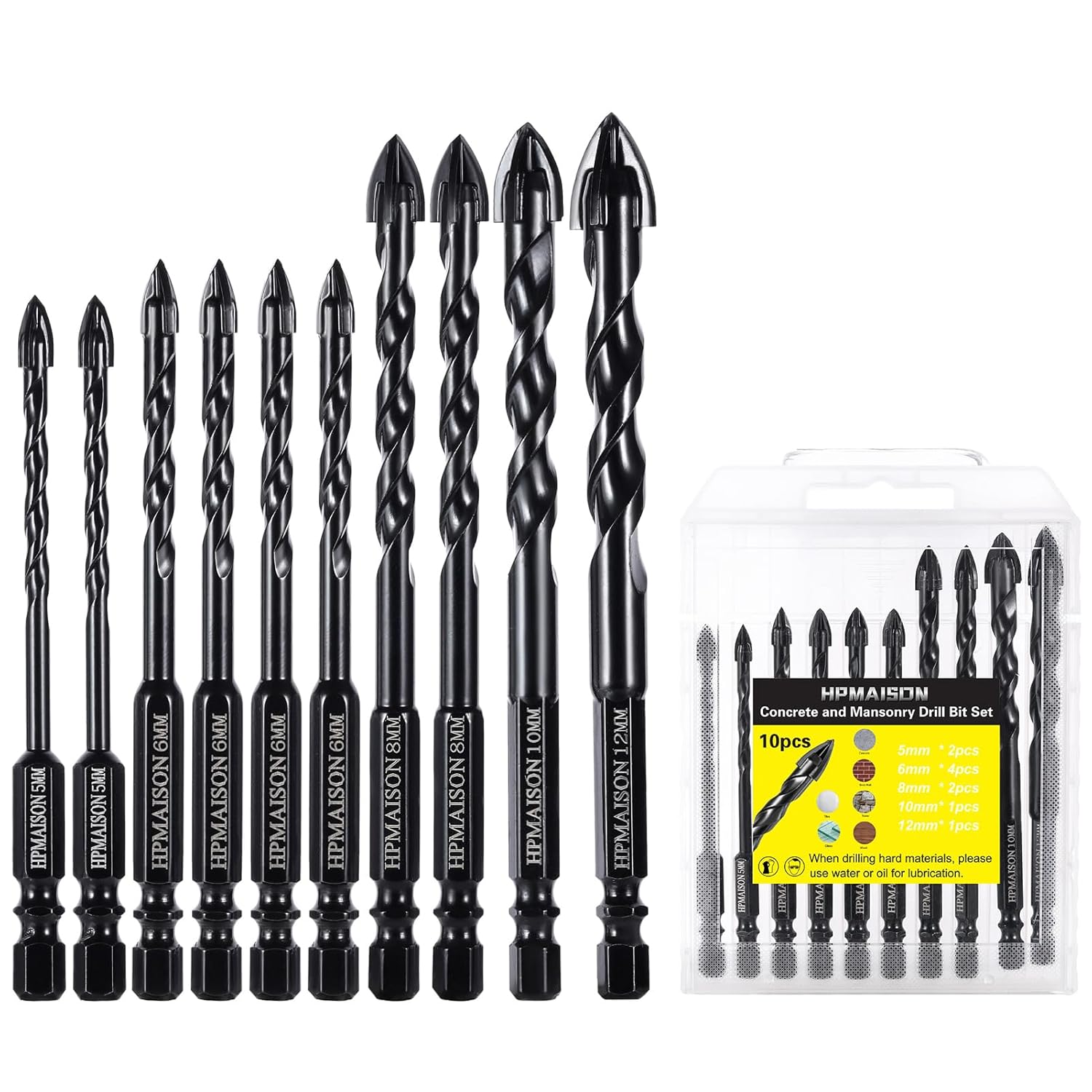 HPMAISON 10PCS Masonry Drill Bits set (carbide-tipped) for concrete, tile, glass and more