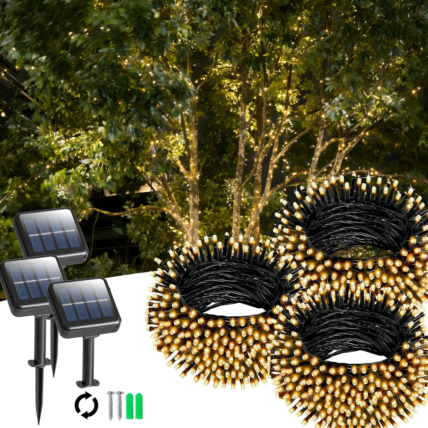 These are solar outdoor string lights for garden and patio decoration. The warm white LEDs are designed to come on automatically at dusk and turn off at dawn, which makes them easy to live with day-to-day. The package is a 3 pack, so it’s aimed at covering more of your space—like a wider section of fencing, a couple of trees, or a long patio run—rather than doing just one small feature.