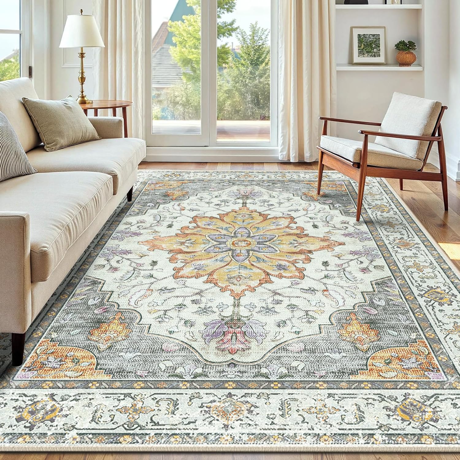 INOVADAY Machine Washable Vintage Low Pile Area Rug, 180x270 cm (Yellow/Grey/Orange/Purple)