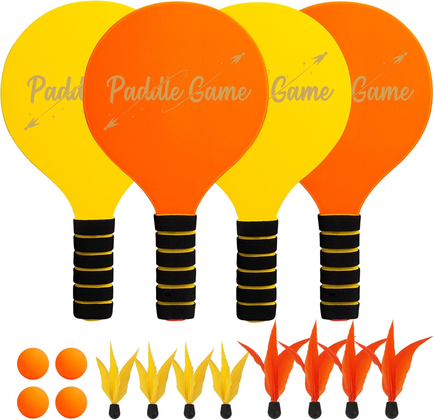 This is a wooden paddle ball racket set with 4 lightweight paddles, a set of high-visibility orange balls and 8 premium birdies (with orange and yellow options for different play speeds). The birdies make the game feel closer to badminton when you use them for rallies.