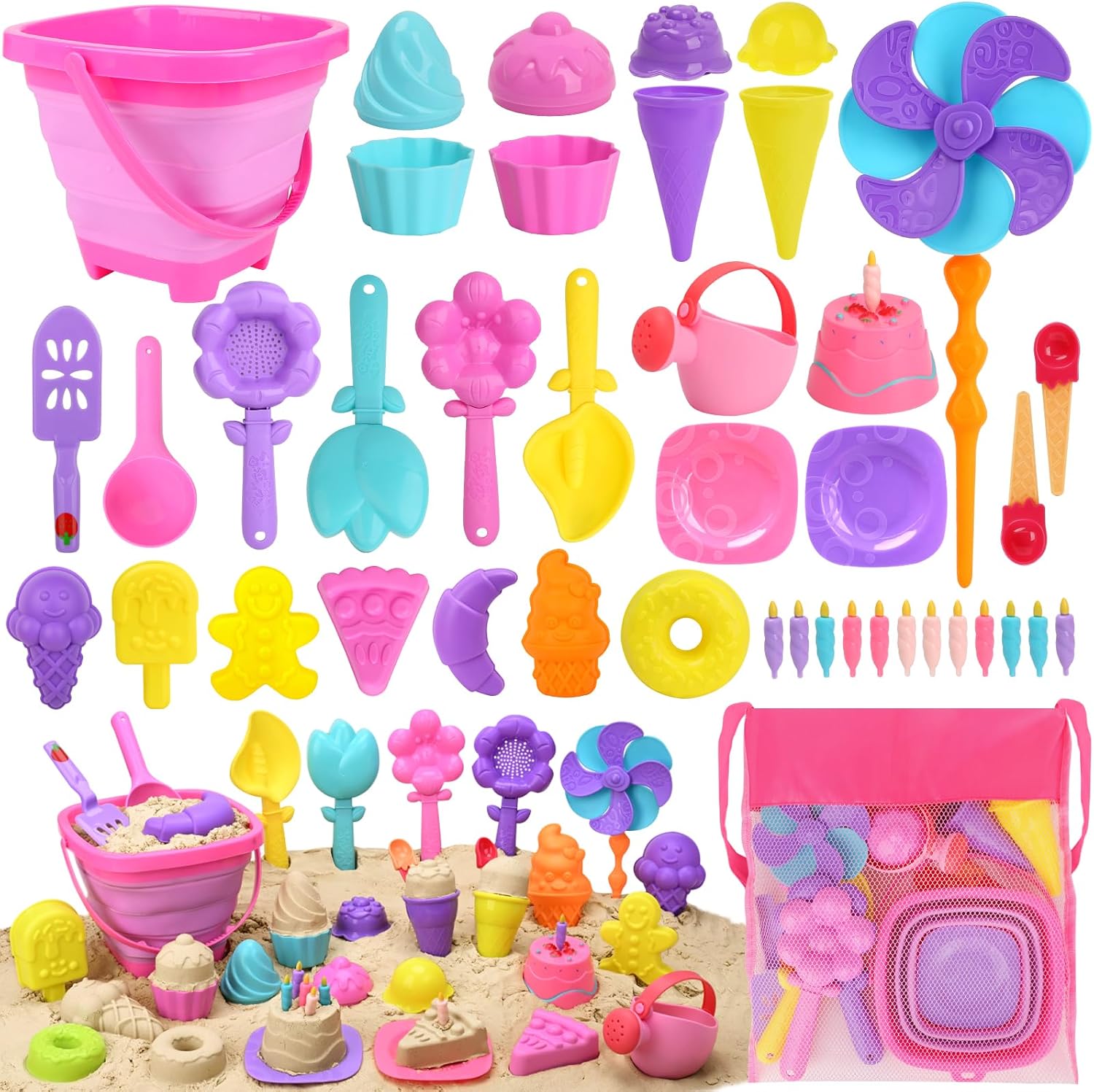 Alongside the pretend desserts, the set includes digging and shaping tools, plus a collapsible bucket and a mesh storage bag. That packaging detail matters more than you might think, because sand toys that are awkward to carry or hard to rinse often end up getting left at home.