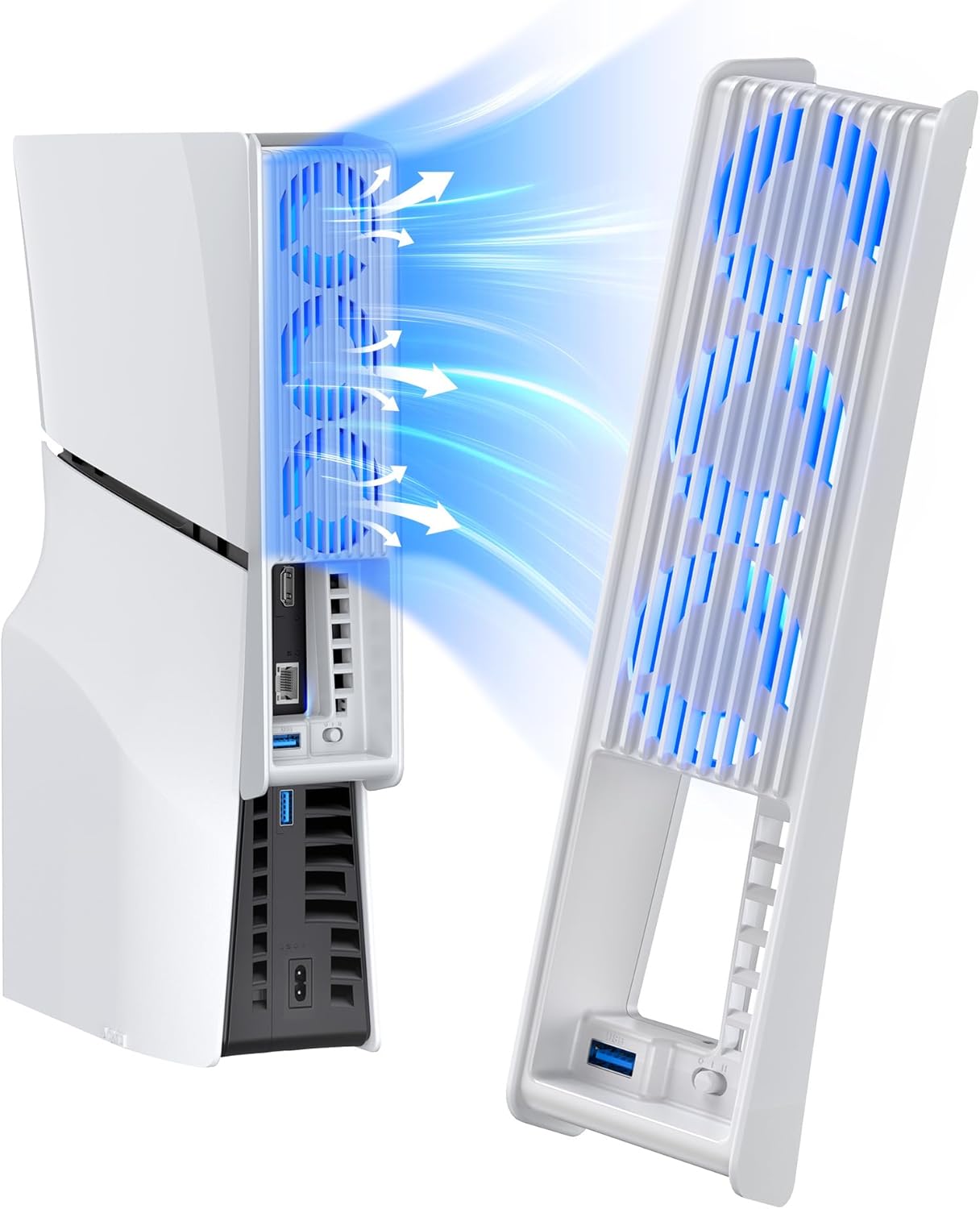 If your PS5 Slim (2023) tends to run warm during longer sessions, a dedicated cooling fan can be a sensible add-on. This KIWIHOME cooling fan is designed specifically for the PS5 Slim disc and digital editions, using three hydraulic-style fans to move more air while aiming to keep noise lower than basic add-ons.