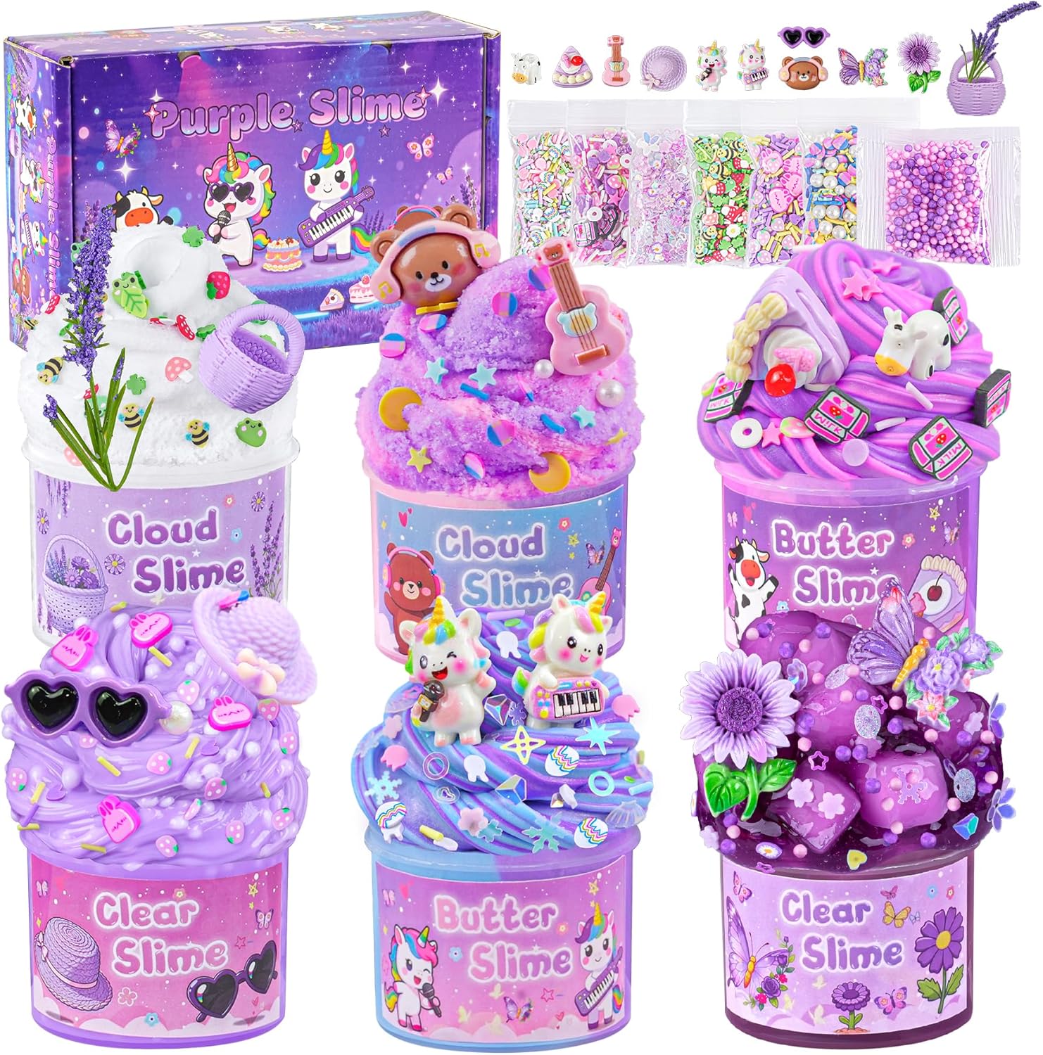 LAWOHO 6-Pack Purple Lavender Slime Kit (Cloud, Clear & Butter Slimes) with Charms & Add-ins