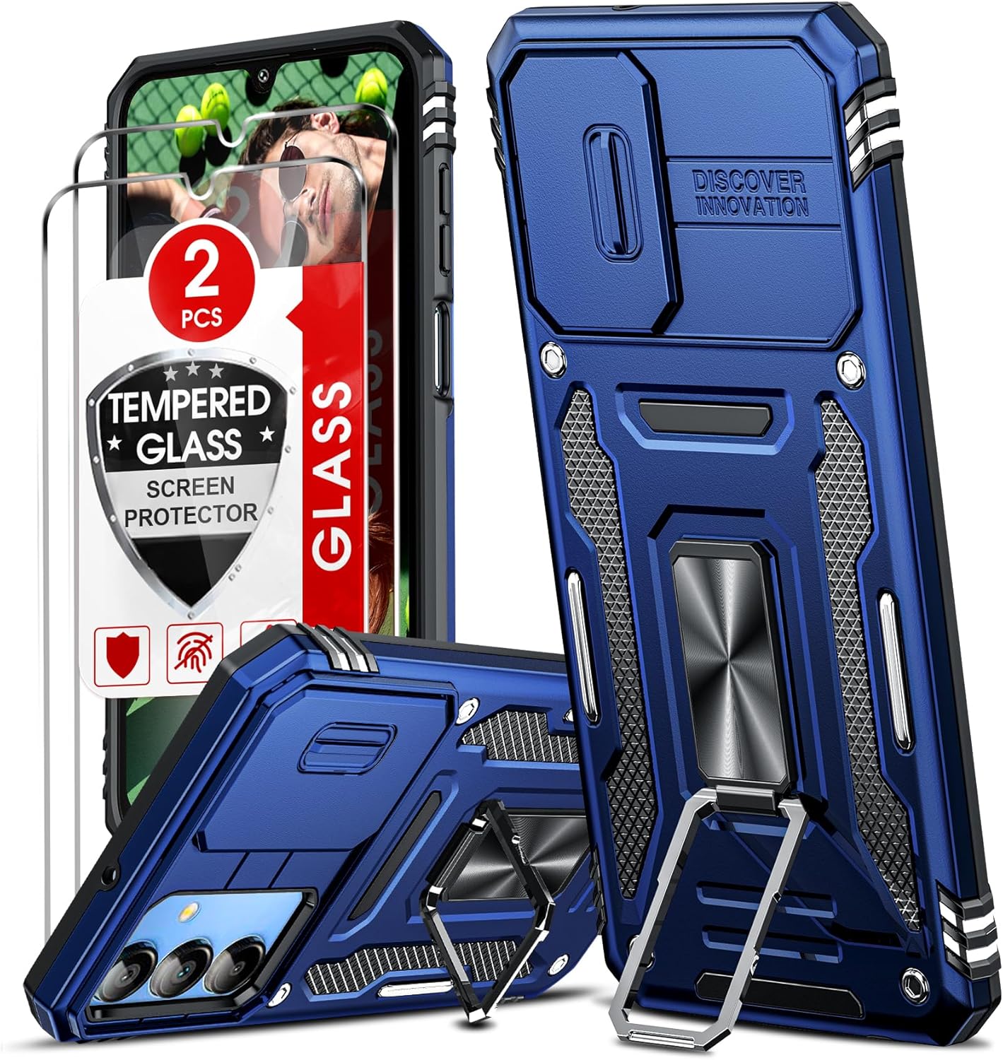LeYi for Samsung Galaxy A15 is shown here in navy blue, and combines shockproof construction, sliding camera cover and a rotatable ring stand for practical everyday use. 🛡️📱🎬.