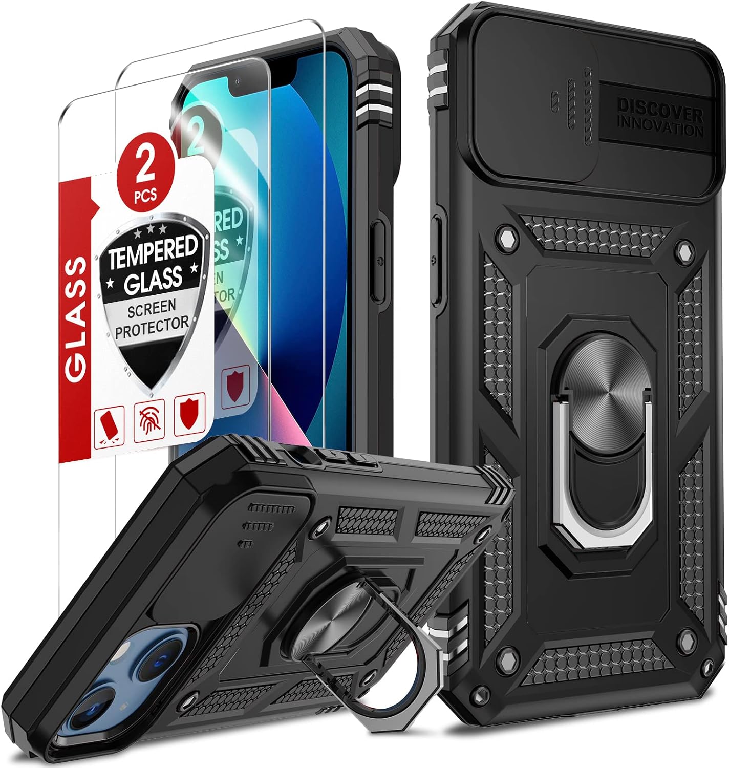 This LeYi case combines a rugged protective shell with a sliding camera cover and two tempered glass screen protectors, designed for the iPhone 13 6.1". It aims to reduce everyday risk to the phone by shielding the screen and camera lens, while the integrated ring stand adds hands‑free convenience. If you plan to use wireless charging, take the case off according to the manufacturer as the built‑in metal plate prevents wireless charging.