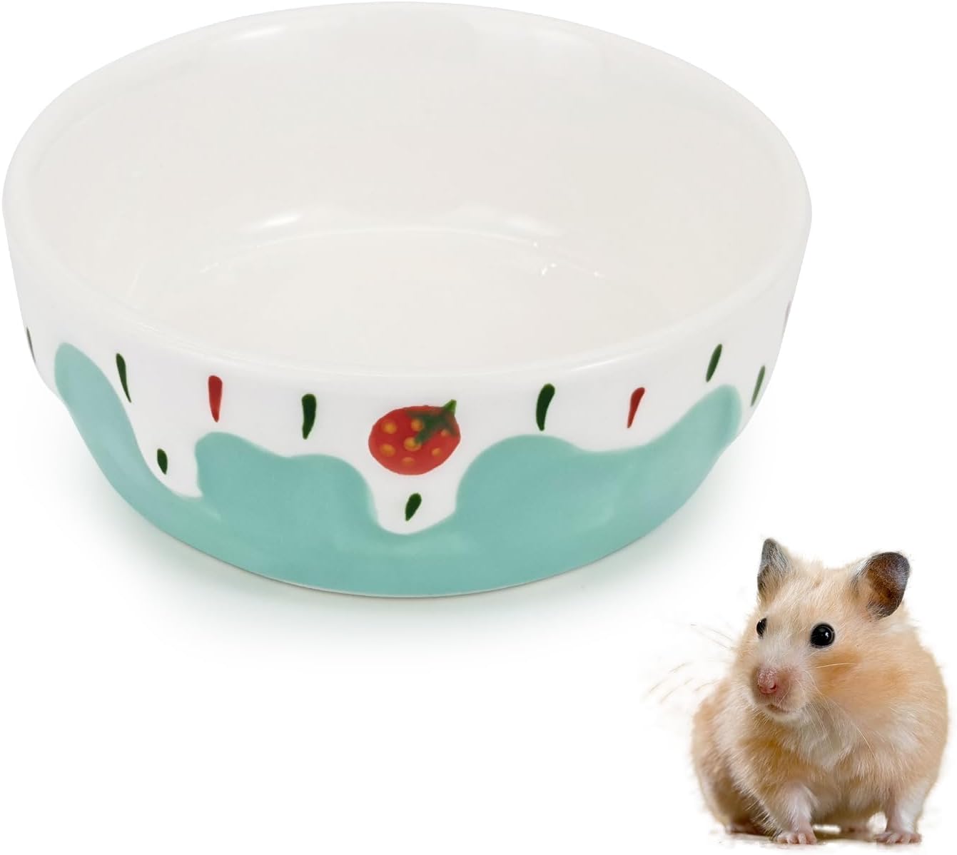 It’s a small, round dish (7 x 7 x 3.5cm) with a cute strawberry design on the outside, and it’s described as anti-tipping due to its moderate weight (125g). On paper, that combination—ceramic durability plus stability—makes it a practical choice for small animal setups where you want less mess and less “dish repositioning” during the day.