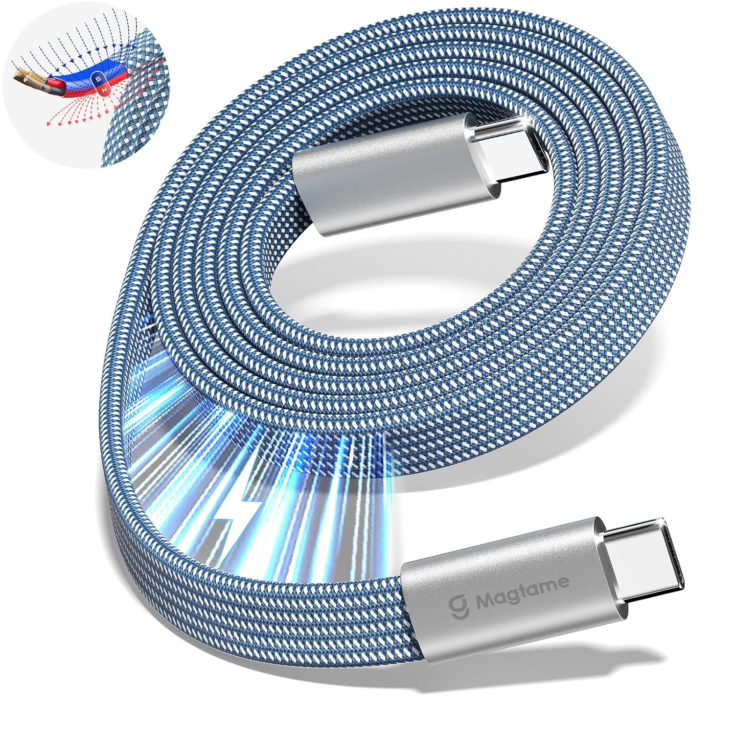 - Magtame Magnetic USB-C Cable (Flat Coiled, 60W/3A, Retractable) – Fast Charging USB-C to USB-C, 3.3 ft, Silver
