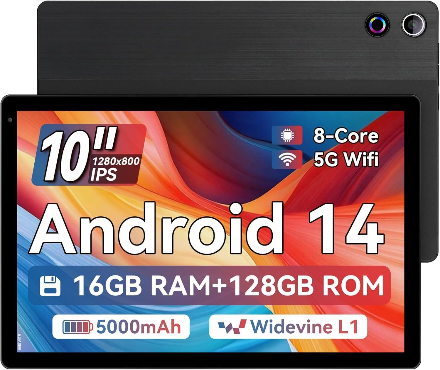 - Ainmel 10 Inch Android 14 Tablet (16GB RAM, 128GB ROM, 1280×800 IPS, 5G/2.4G WiFi, BT 5.0) – Silver