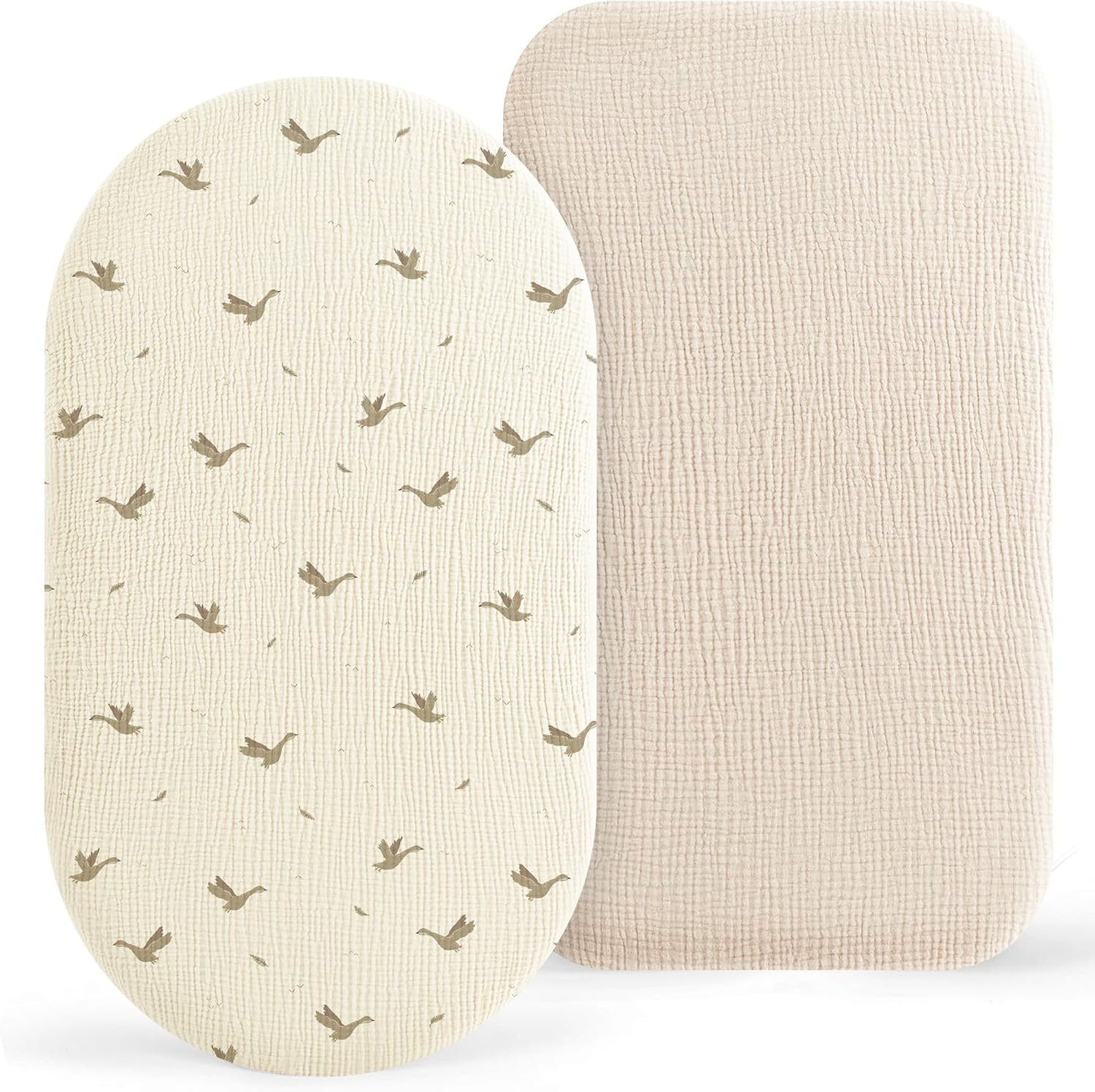 This is a 2-pack of fitted bassinet sheets made from 100% muslin cotton. The idea is simple: a soft, breathable fabric that sits gently against your baby’s skin, while the fitted design (including a 360-degree elastic band with extra stretch) helps the sheet grip the mattress rather than ride up.