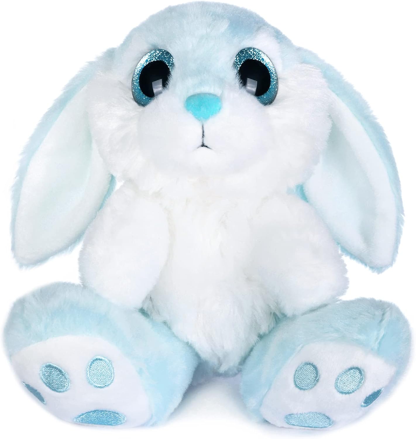 The toy comes in a blue theme and leans into the classic bunny look: bright eyes, a pink nose, and stitched details that aim to keep the shape looking neat.